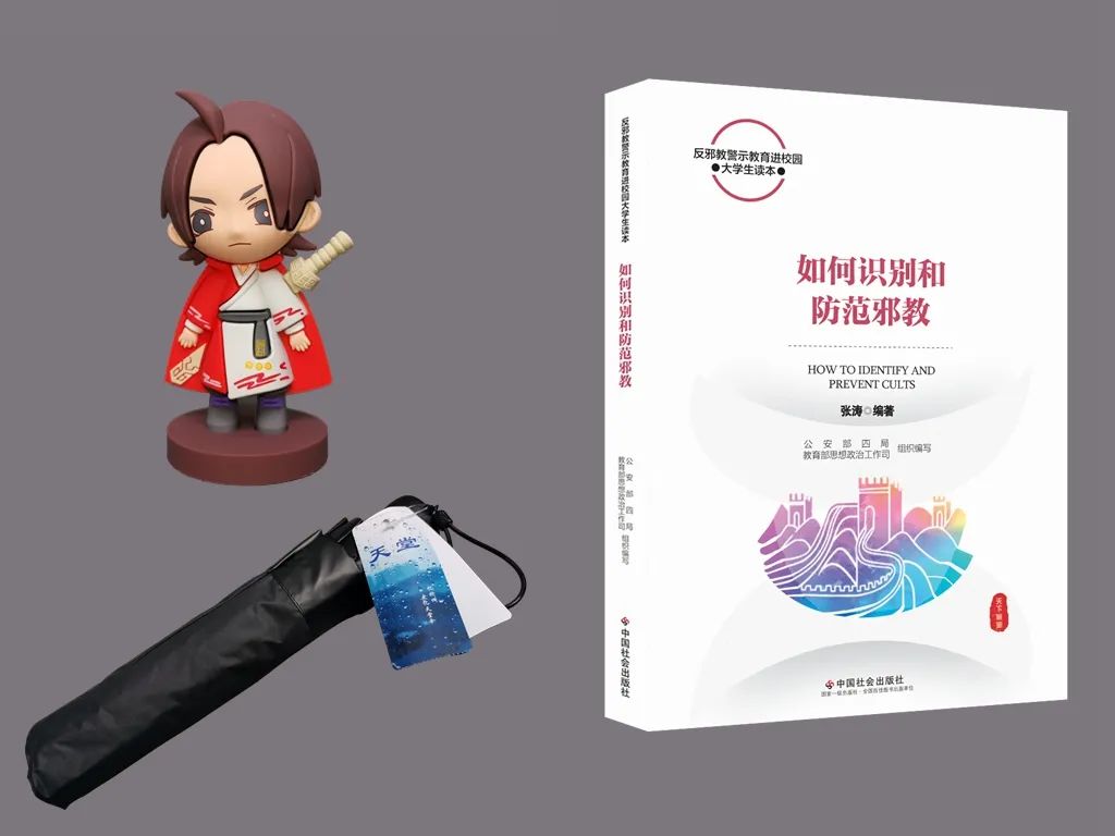 《如何识别和防范邪教》、雨伞及无邪君摆件