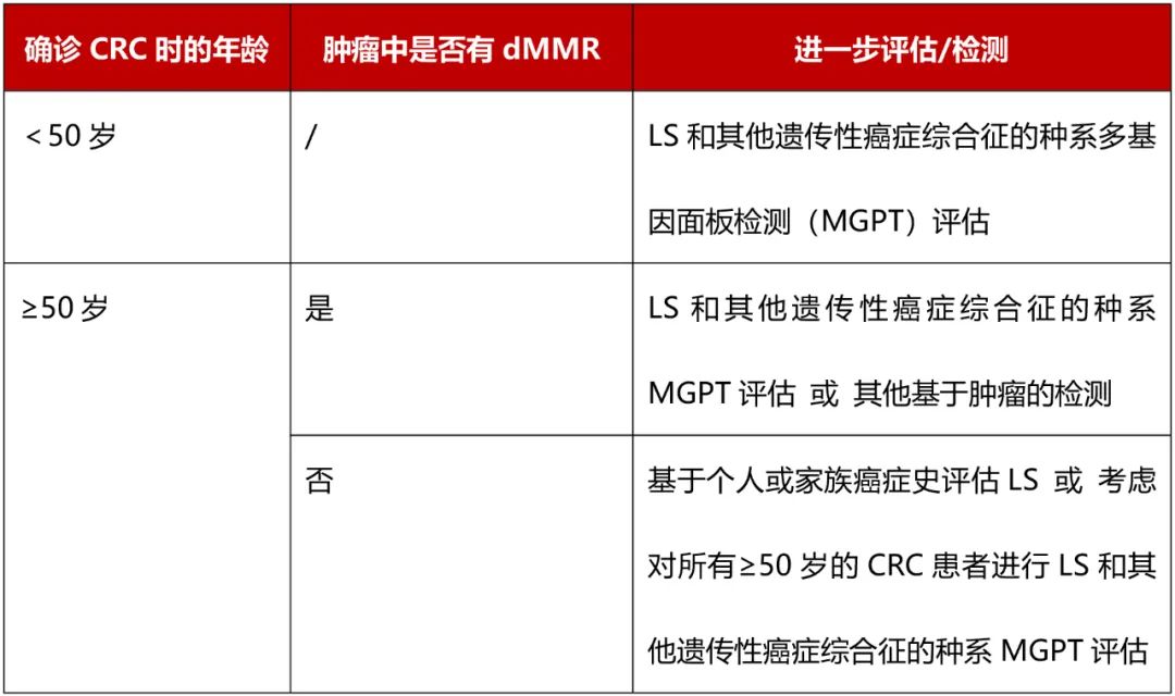 而在对50岁以上、肿瘤中无dMMR的CRC患者进行“基于个人或家族癌症史的LS评估”时,指南给出了如下建议: