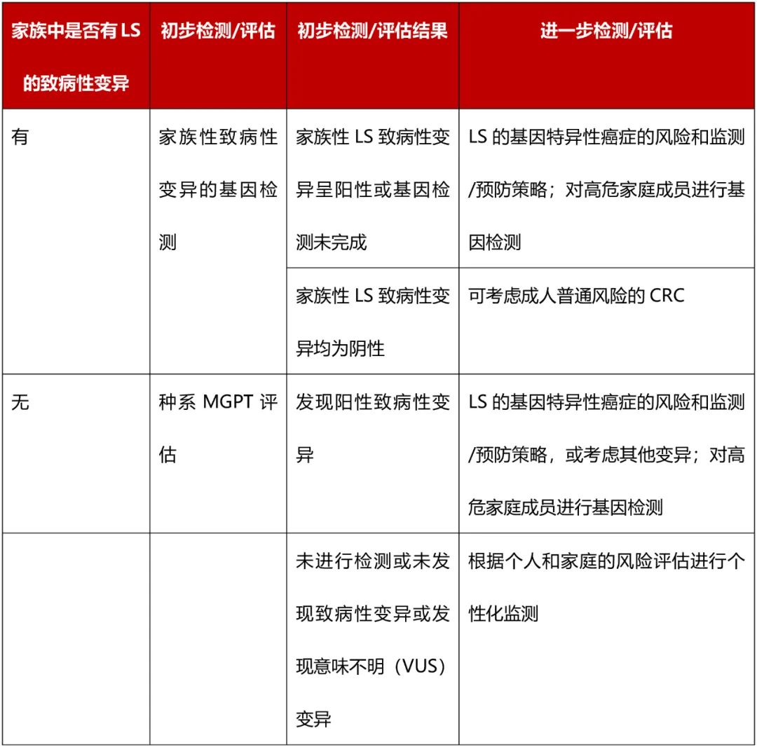 同样,在遗传CRC综合征的评估中,如果个体没有结直肠息肉病或致病性变异癌症基因的个人或家族病史,也没有与息肉病综合征相关症状的病史,却有CRC的个人病史,则考虑对其“是否存在LS和其他癌症的风险基因”进行评估: