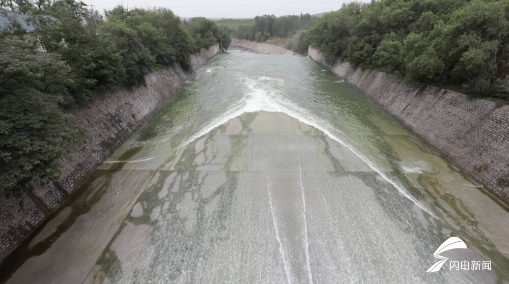 为做好强降雨应对防范工作,潍坊市高崖水库从7月19日14时起开启溢洪闸放水,放水流量为20立方米/秒。20日,记者在水库溢洪闸处看到,两孔闸门已经开启,滚滚清水带着隆隆响声从闸门下方喷涌而出,沿着溢洪道向下游流去。