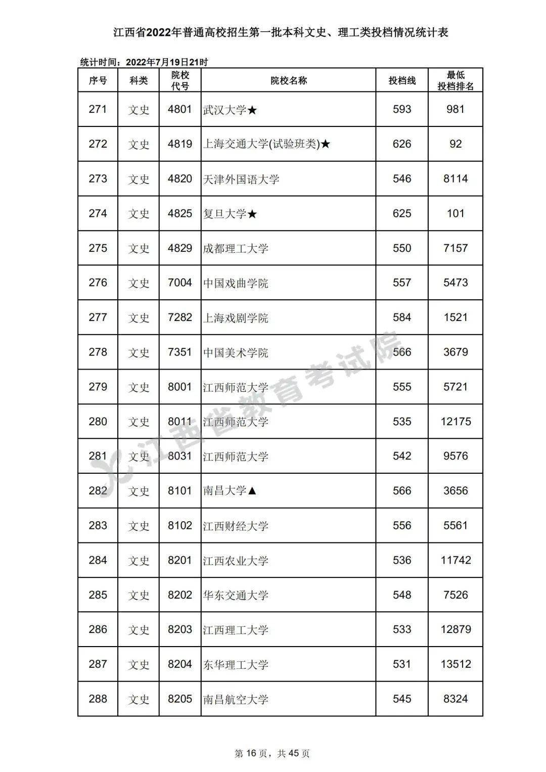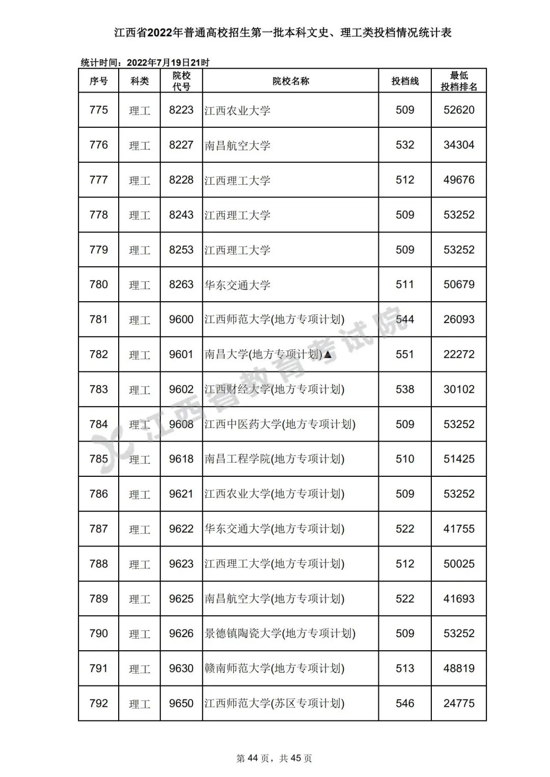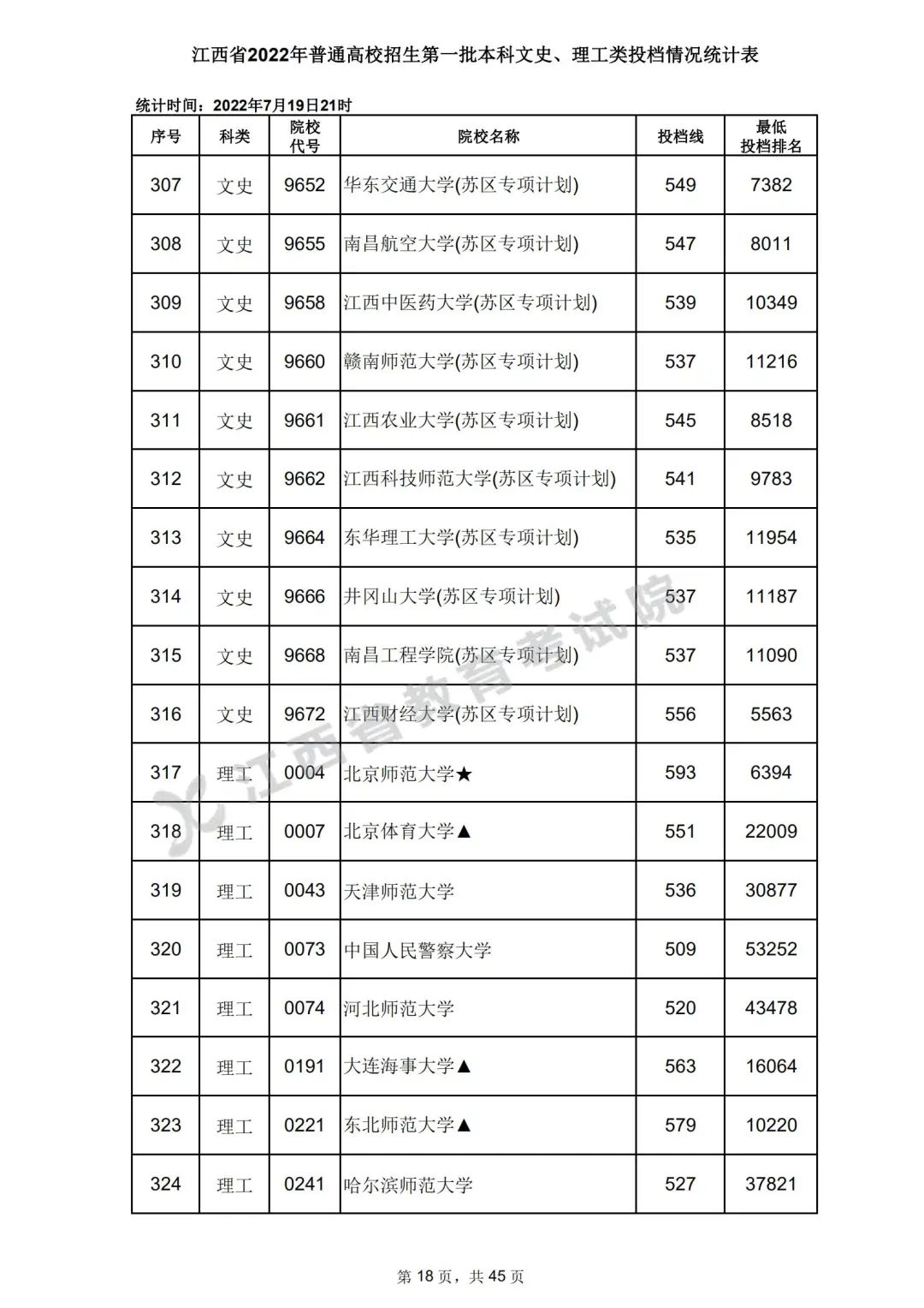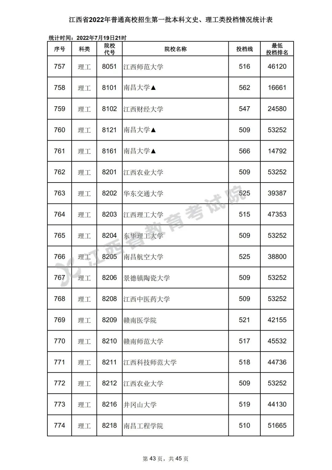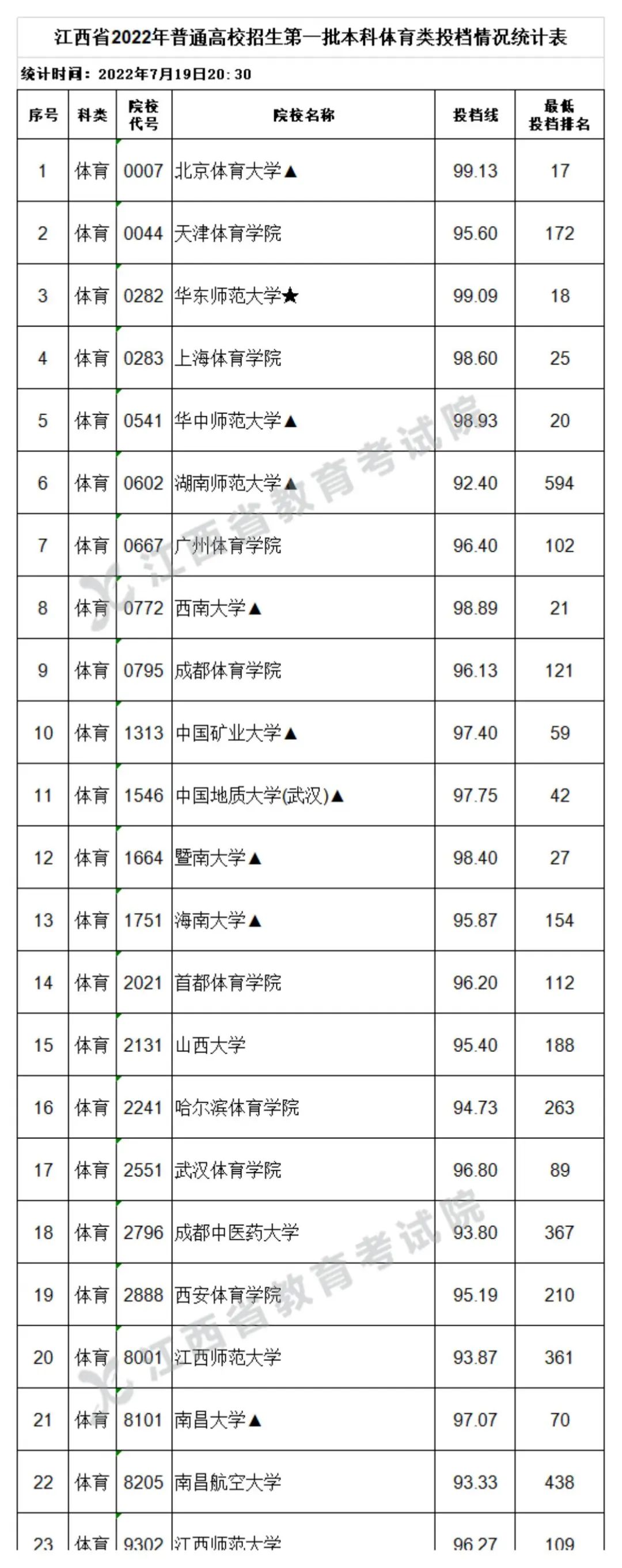 7月20日,江西省教育考试院公布江西省2022年普通高校招生第一批本科文史、理工类、体育类投档情况,具体如下: