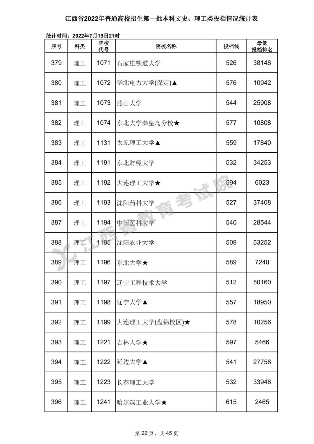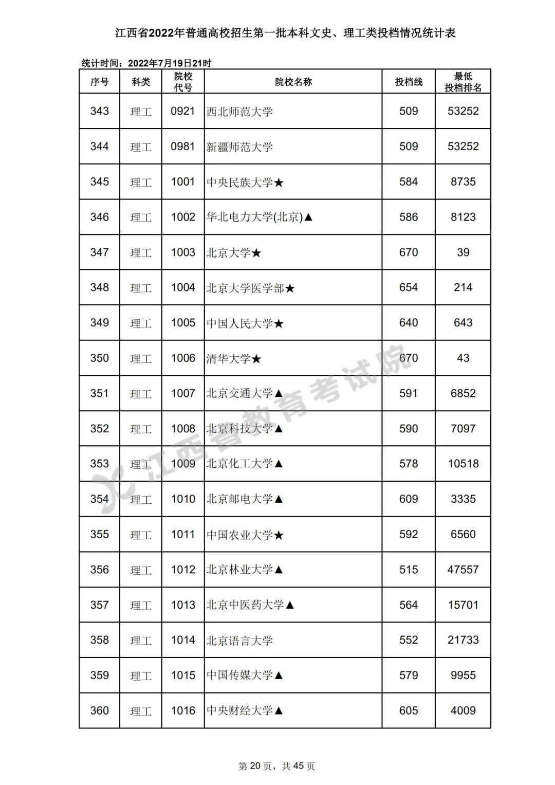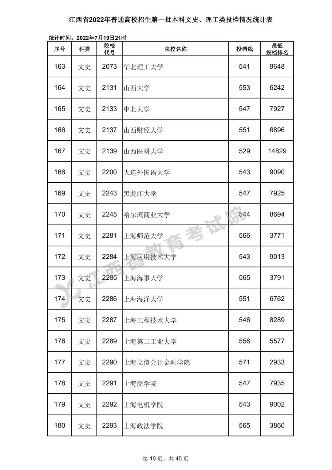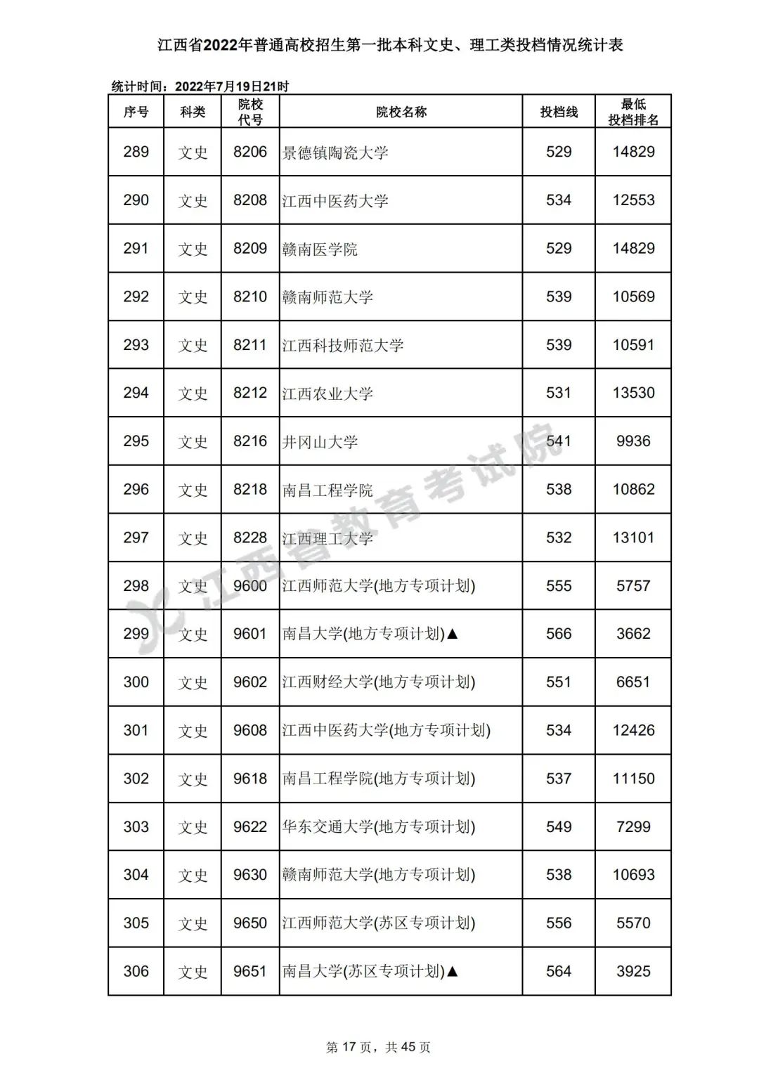 7月20日,江西省教育考试院公布江西省2022年普通高校招生第一批本科文史、理工类、体育类投档情况,具体如下:
