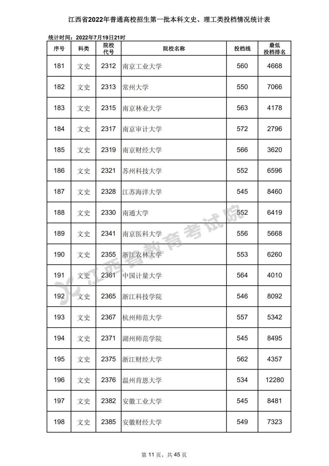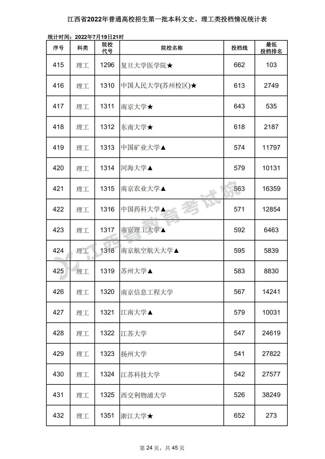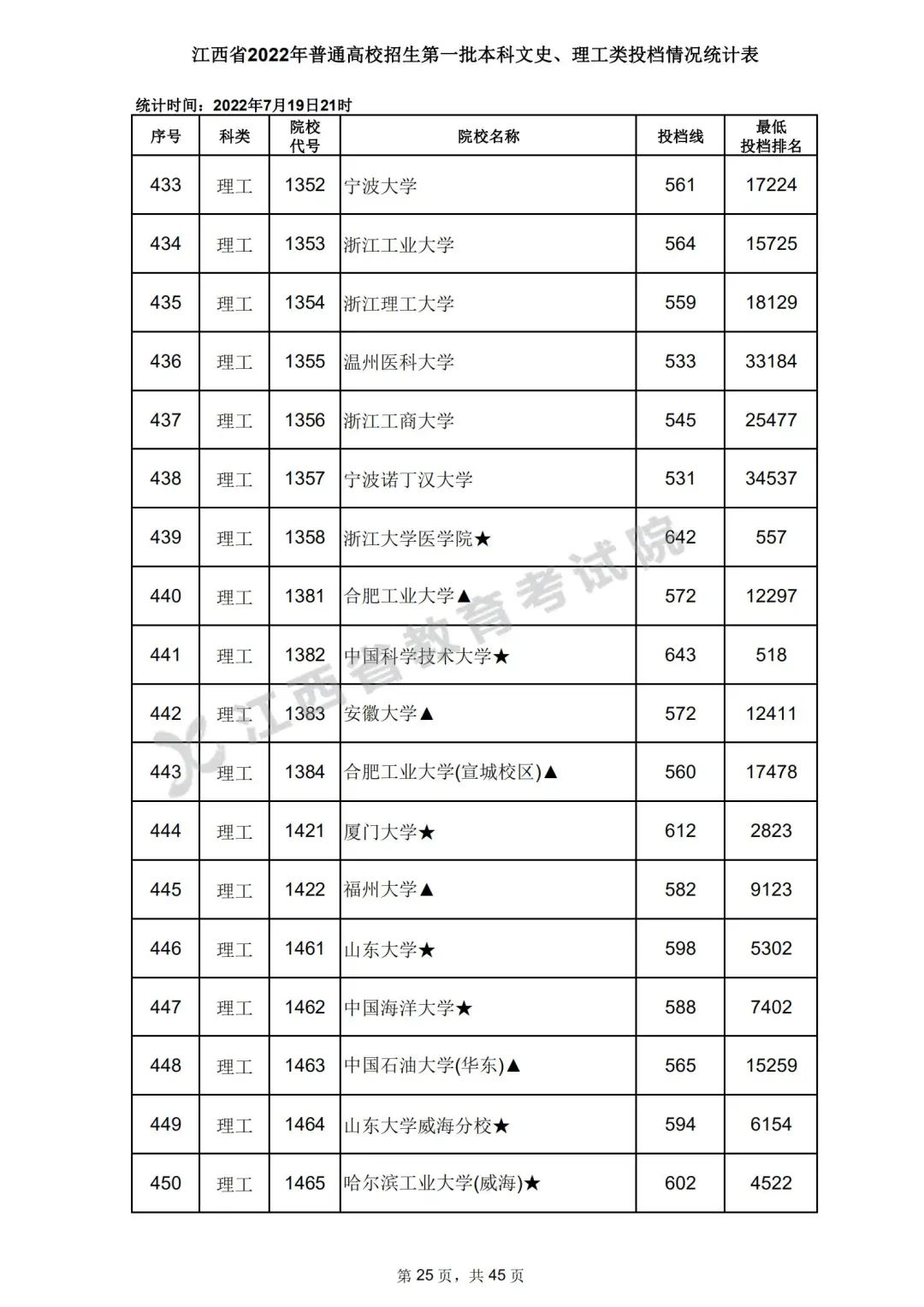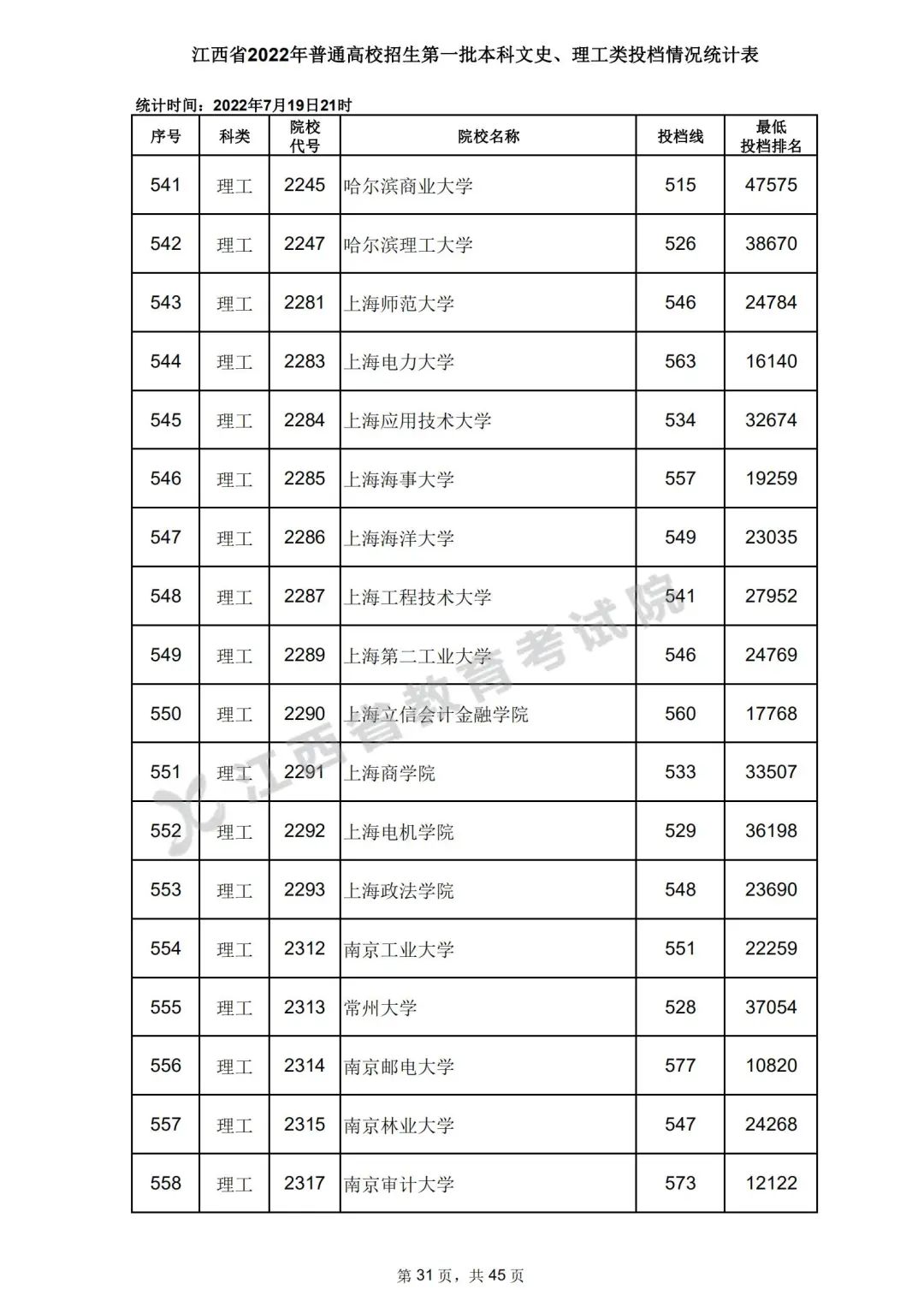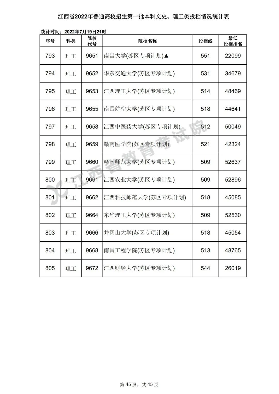 7月20日,江西省教育考试院公布江西省2022年普通高校招生第一批本科文史、理工类、体育类投档情况,具体如下: