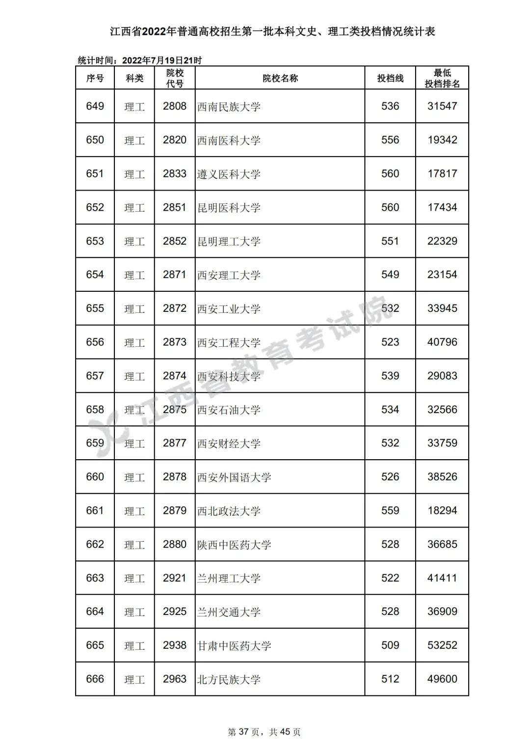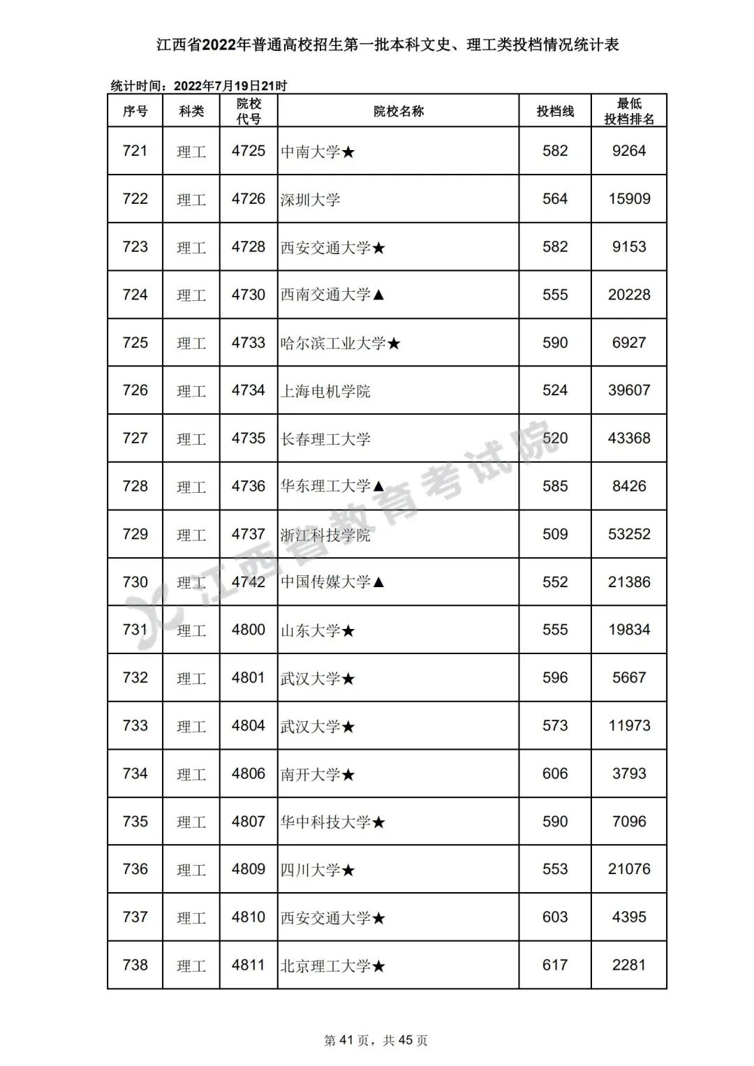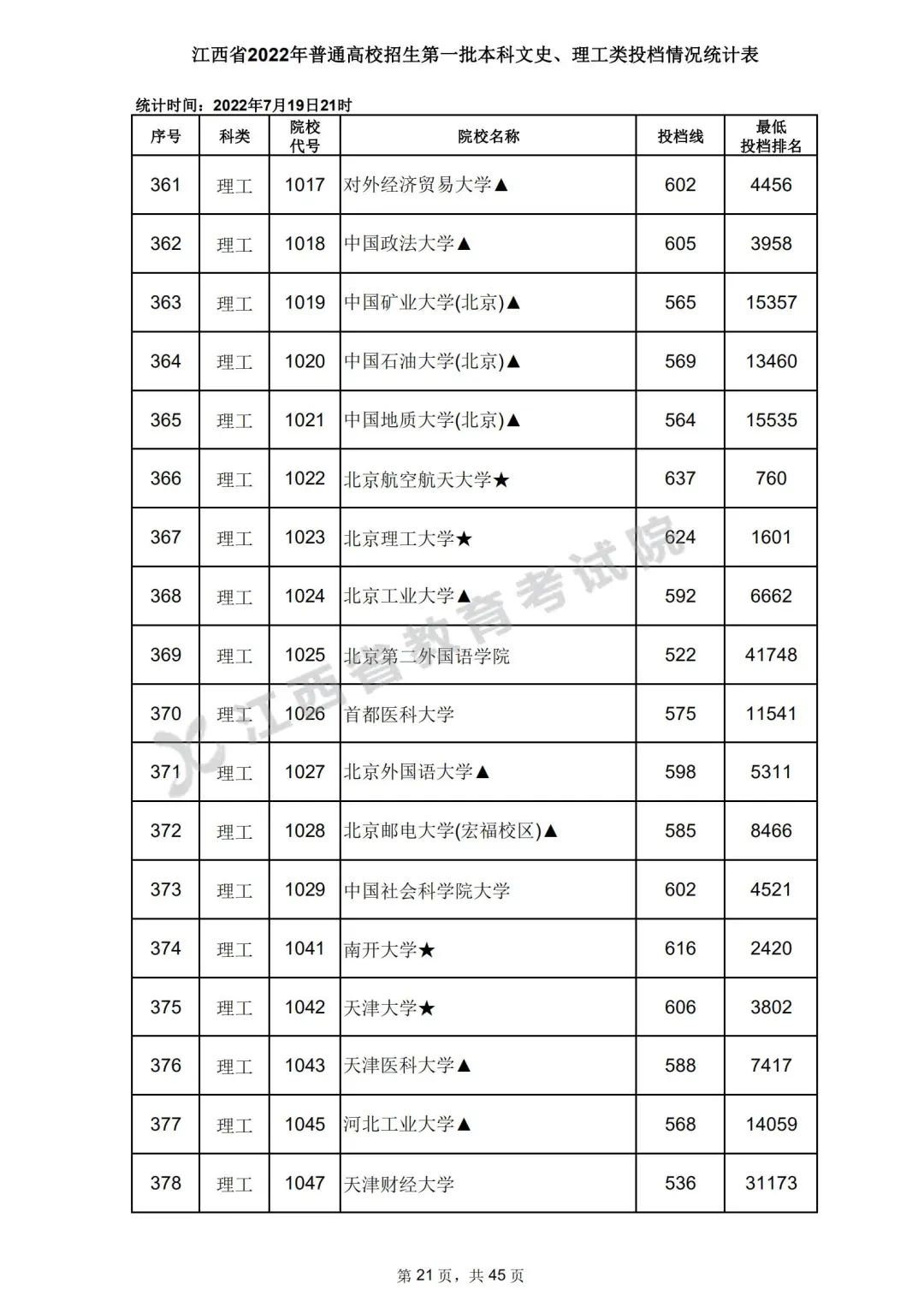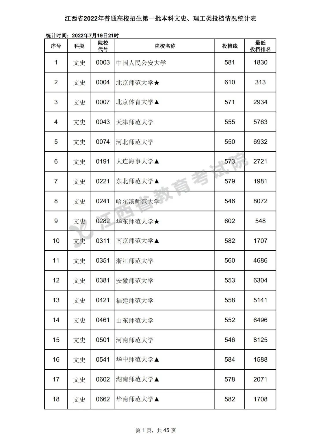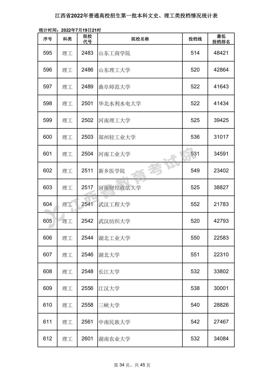 7月20日,江西省教育考试院公布江西省2022年普通高校招生第一批本科文史、理工类、体育类投档情况,具体如下: