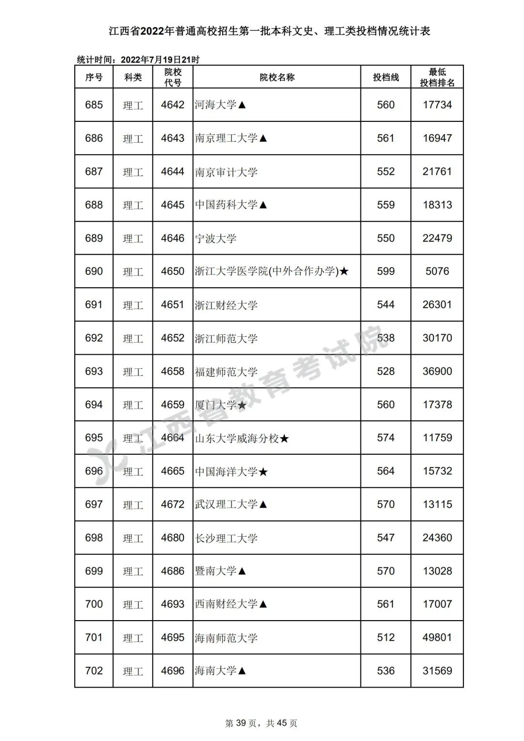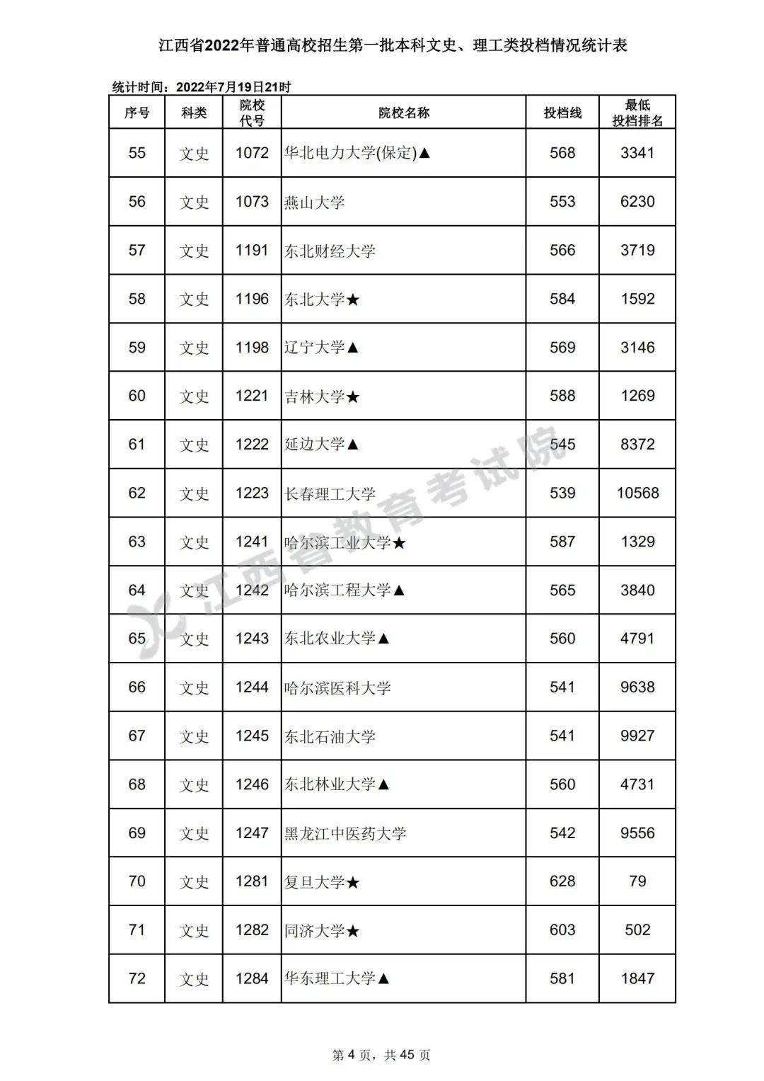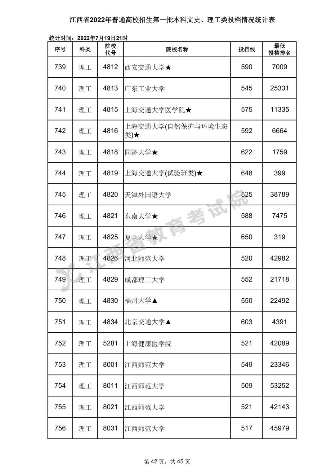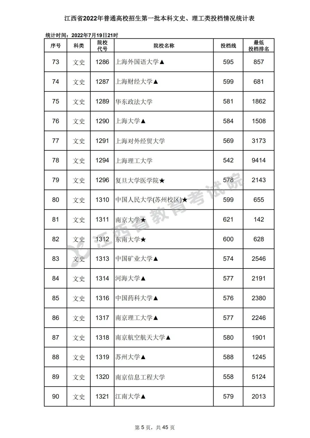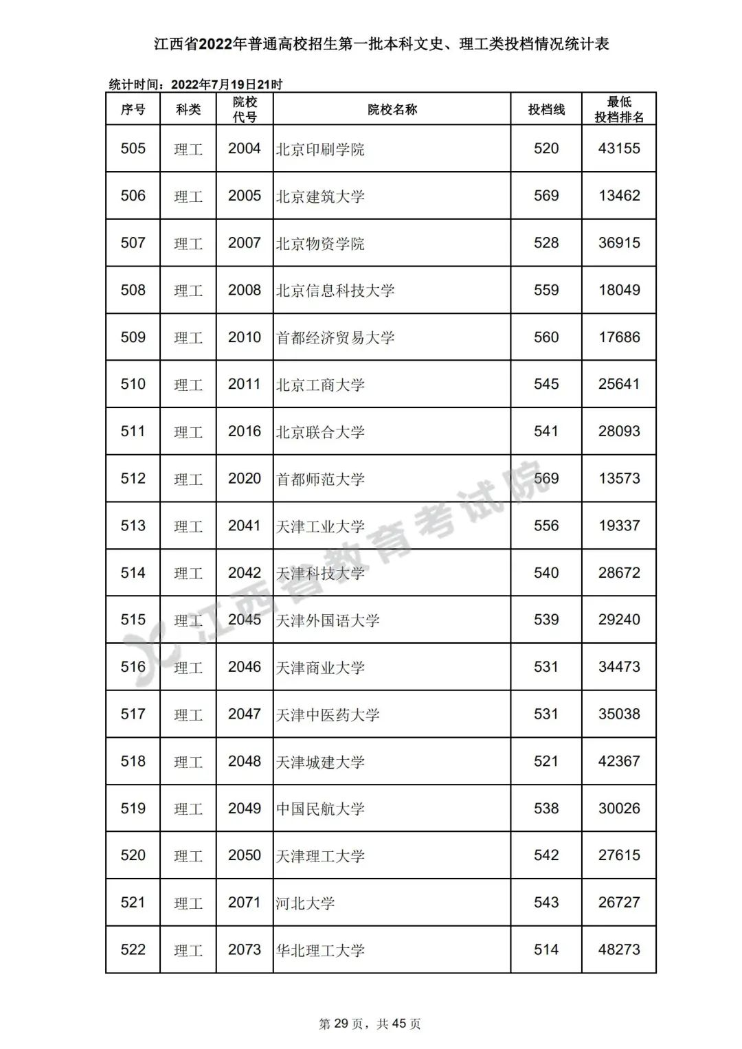 7月20日,江西省教育考试院公布江西省2022年普通高校招生第一批本科文史、理工类、体育类投档情况,具体如下: