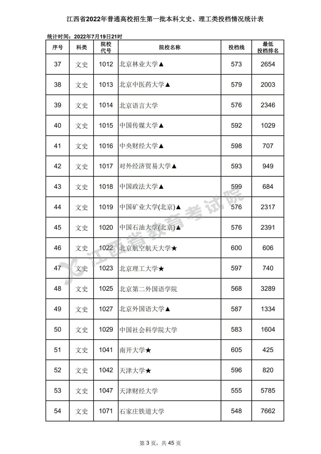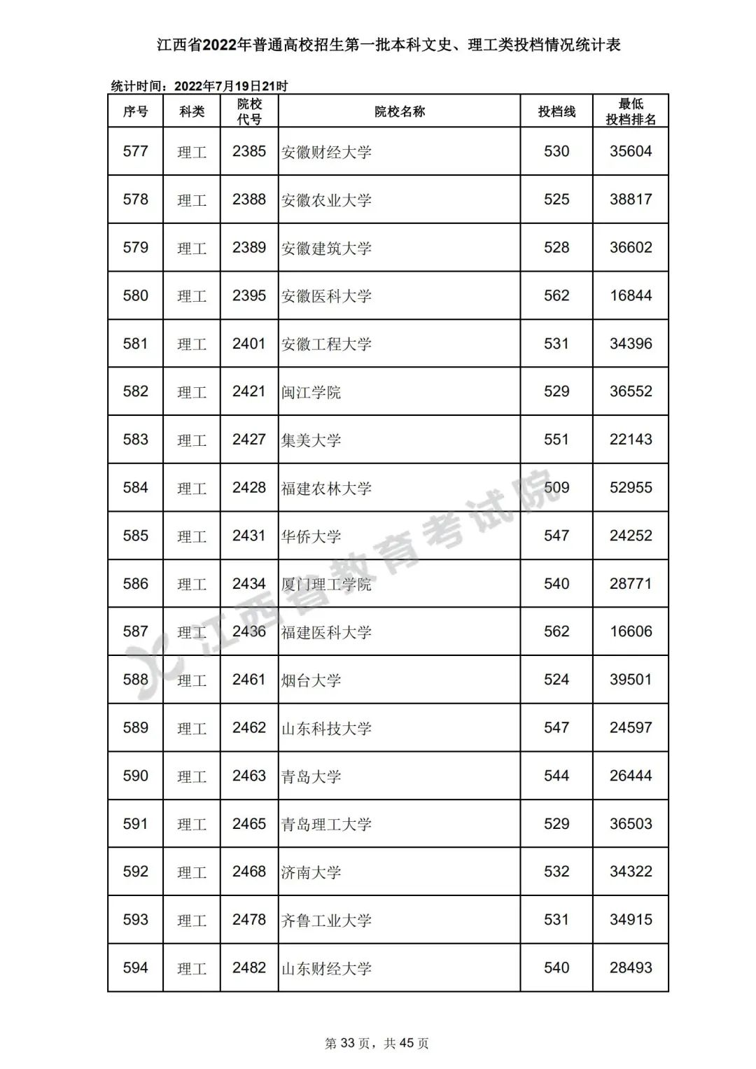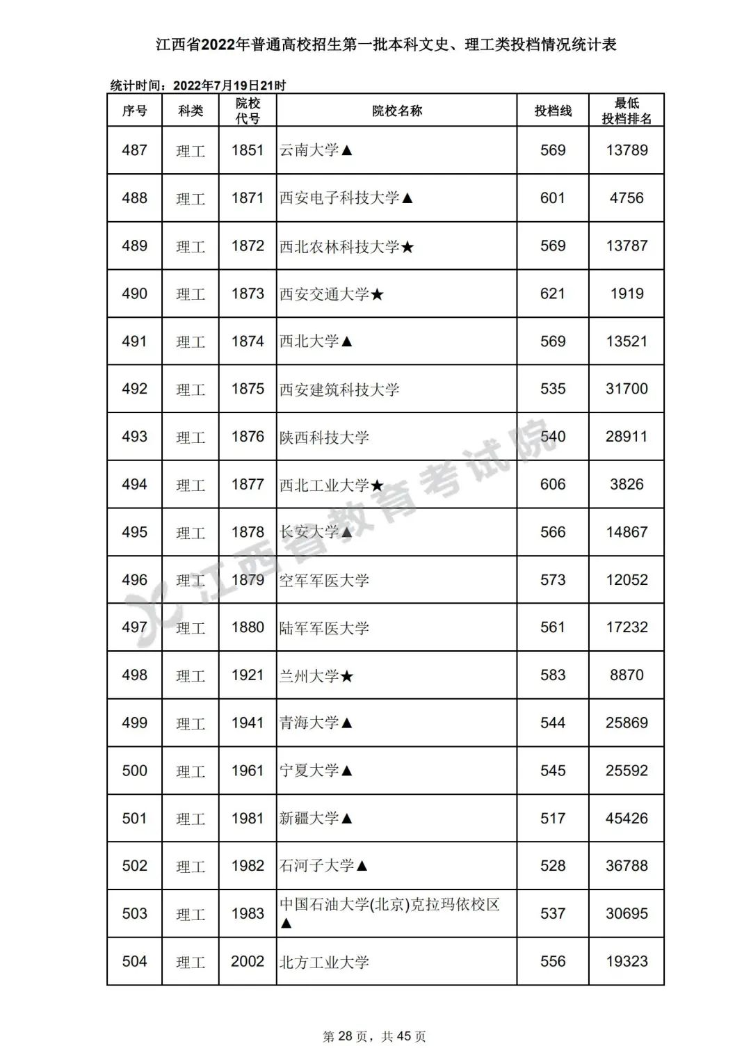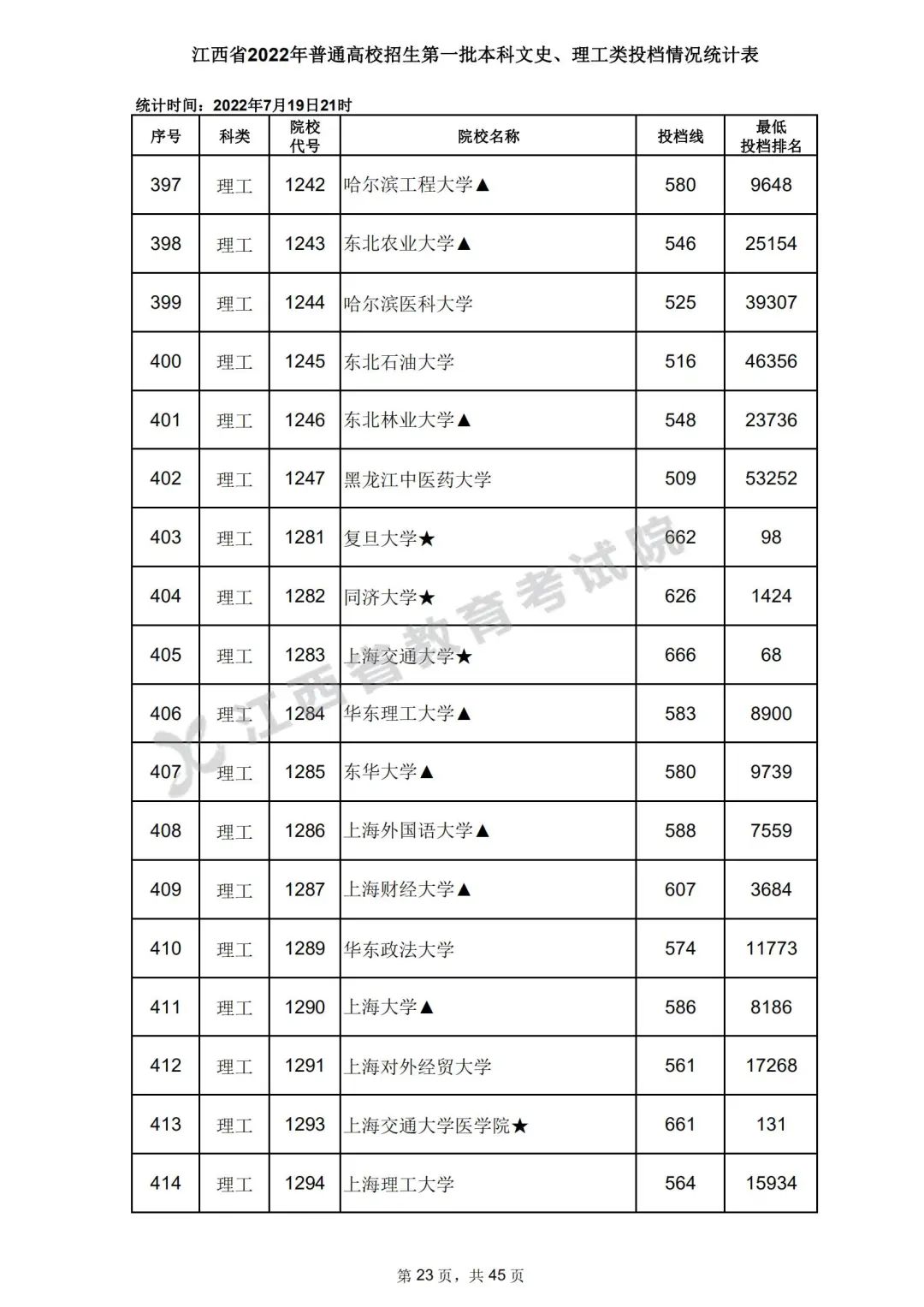 7月20日,江西省教育考试院公布江西省2022年普通高校招生第一批本科文史、理工类、体育类投档情况,具体如下: