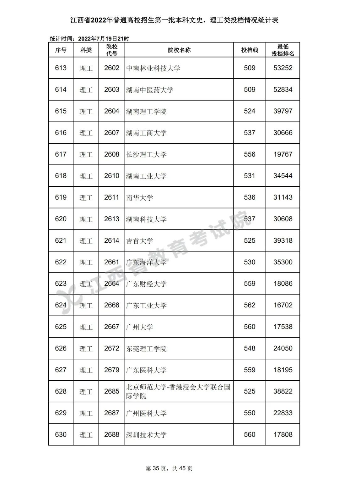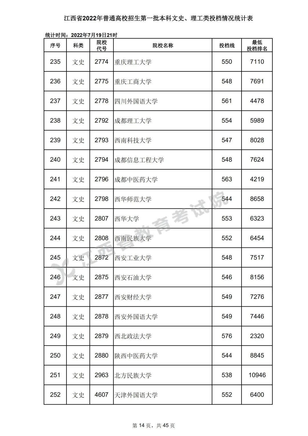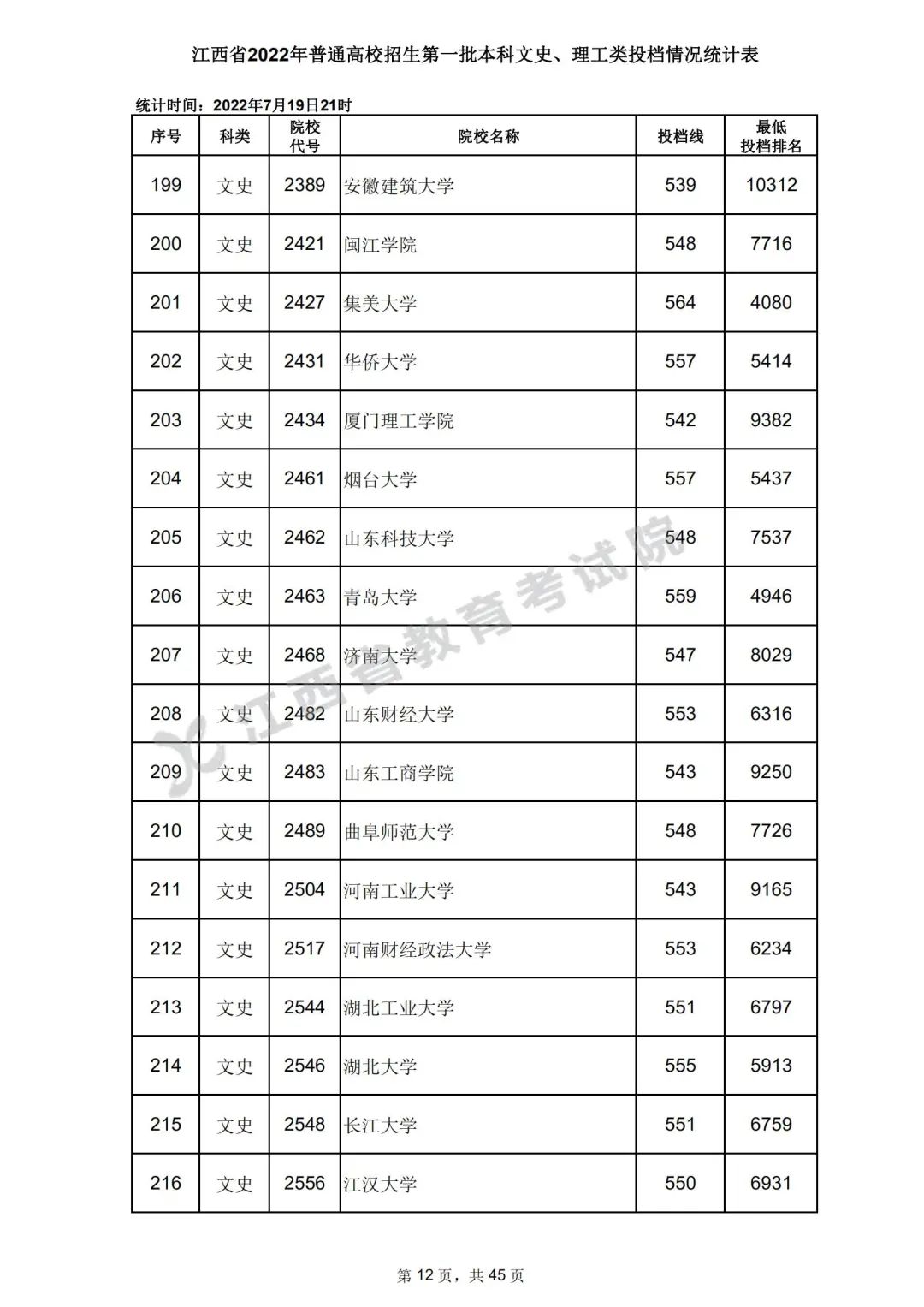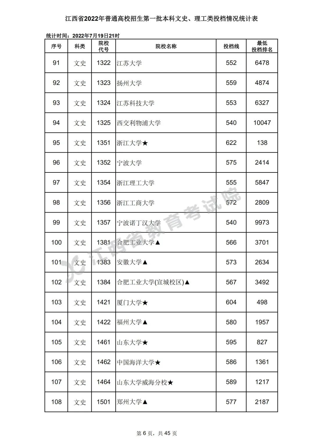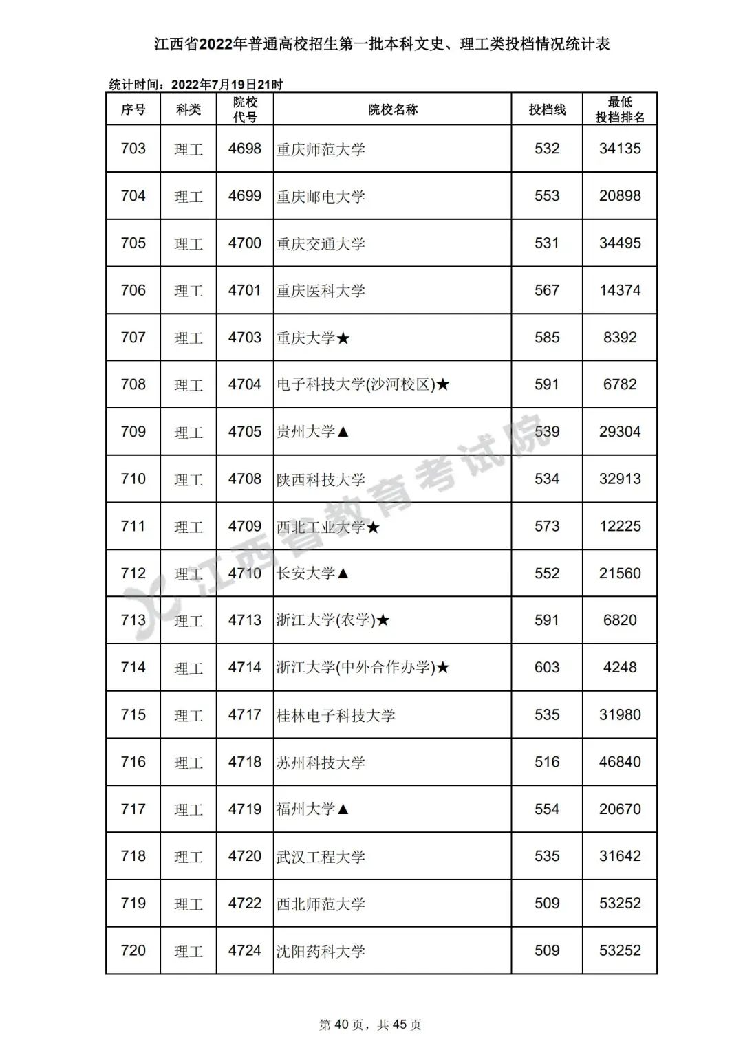 7月20日,江西省教育考试院公布江西省2022年普通高校招生第一批本科文史、理工类、体育类投档情况,具体如下:
