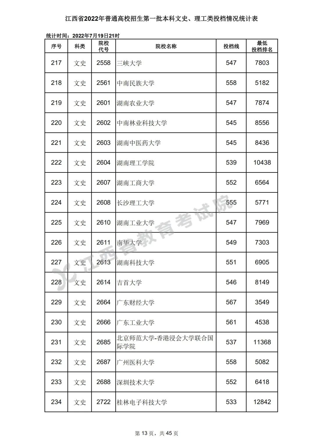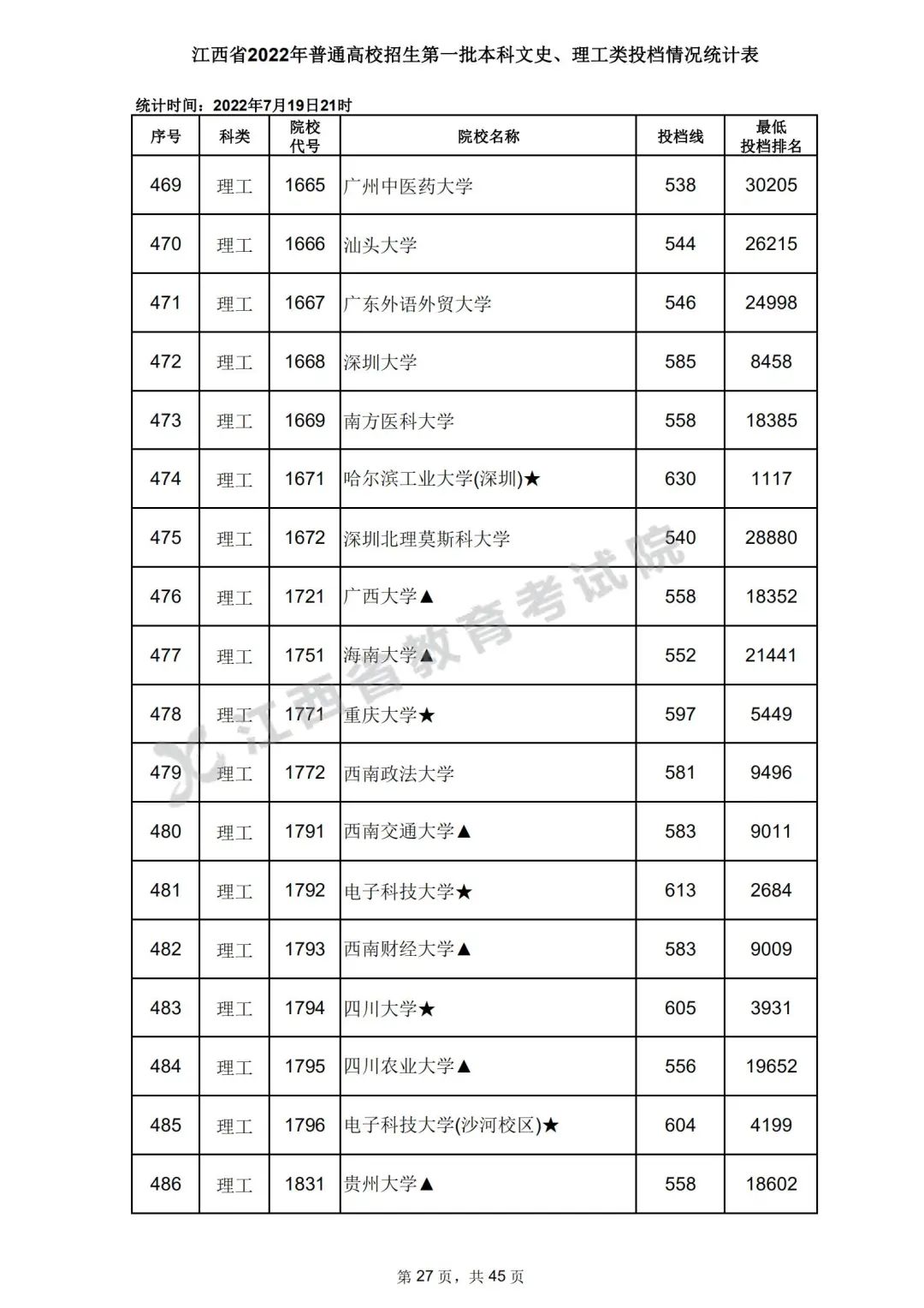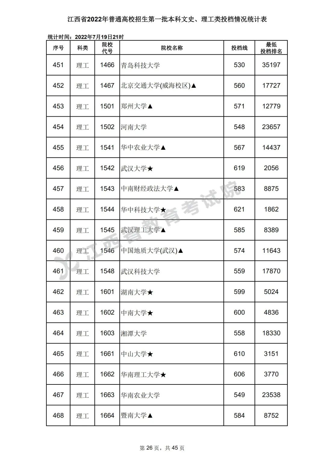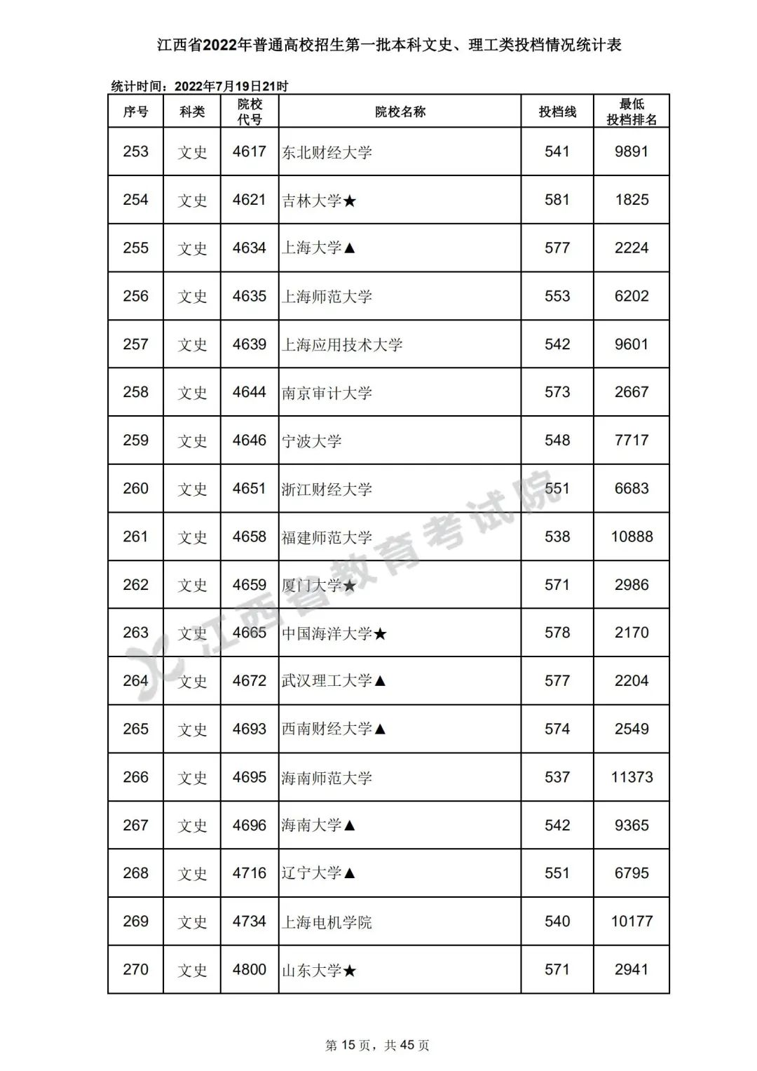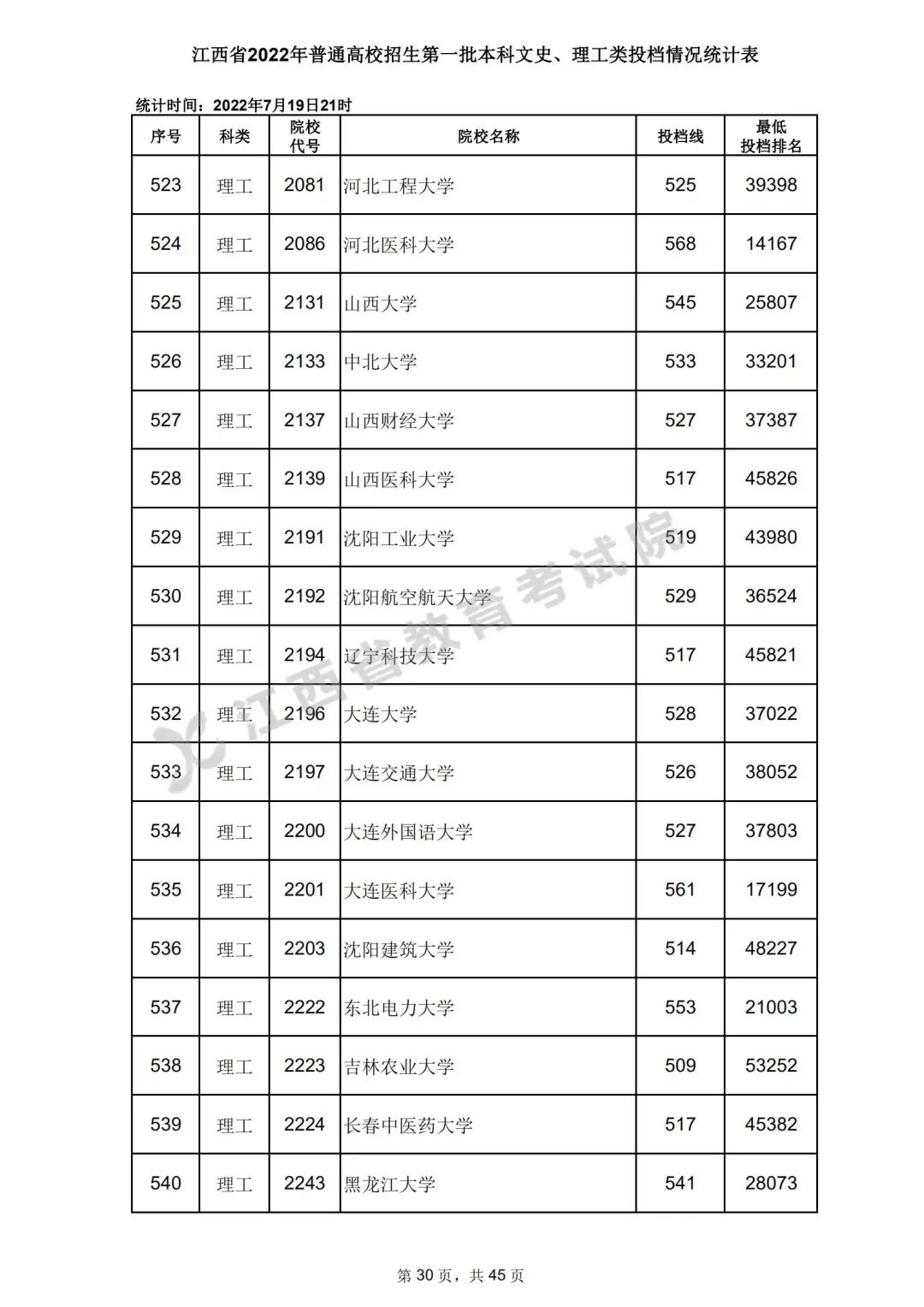 7月20日,江西省教育考试院公布江西省2022年普通高校招生第一批本科文史、理工类、体育类投档情况,具体如下: