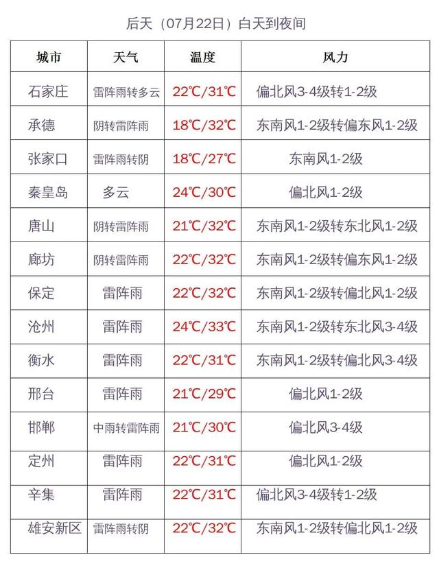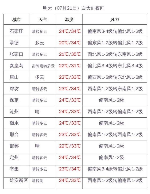 明天夜间到22日,张家口、承德西部、保定、雄安新区、石家庄、衡水、邢台、邯郸多云转阴有雷阵雨,其中邢台、邯郸局地有中到大雨,其他地区晴转多云。