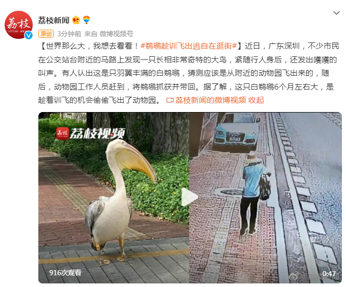 近日,广东深圳,不少市民在公交站台附近的马路上发现一只长相非常奇特的大鸟,紧随行人身后,还发出嚄嚄的叫声。有人认出这是只羽翼丰满的白鹈鹕,猜测应该是从附近的动物园飞出来的,随后,动物园工作人员赶到,将鹈鹕抓获并带回。据了解,这只白鹈鹕6个月左右大,是趁着训飞的机会偷偷飞出了动物园。
