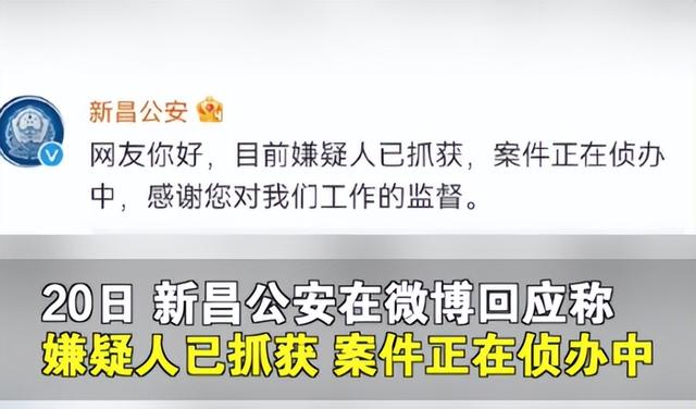 20日,新昌公安在微博回应称嫌疑人已抓获,案件正在侦办中。