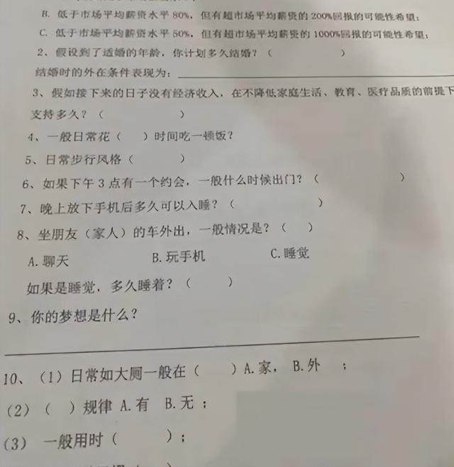 网传试题包含15道题,有哲学题、数学题、日常生活类题,其中就有“日常如大厕一般在家还是在外面,有无规律,用时多久”等问题。