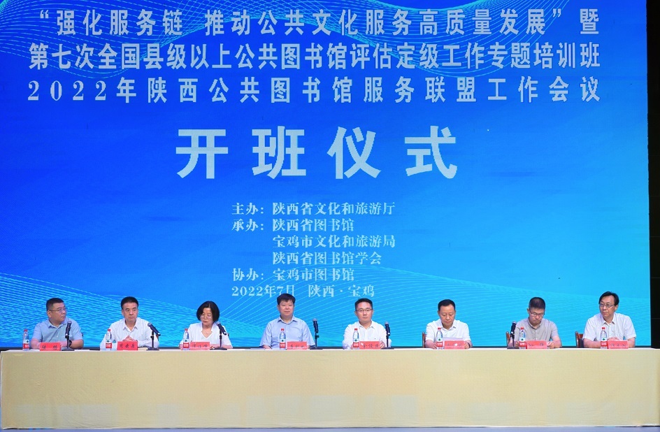 7月20日,由陕西省文化和旅游厅主办,陕西省图书馆、宝鸡市文化和旅游局、陕西省图书馆学会承办,宝鸡市图书馆协办的“强化服务链 推动公共文化服务高质量发展”暨第七次全国县级以上公共图书馆评估定级工作专题培训班在宝鸡开班。陕西省文化和旅游厅党组成员、副厅长唐利如出席开班仪式并讲话,宝鸡市人民政府副市长佘俊臣致辞,宝鸡市文化和旅游局局长周保君、陕西省图书馆党委书记、馆长周云岳等出席开班仪式。省文化和旅游厅公共服务处处长谭佳峰主持开班仪式。