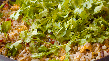 4、加入200g香菜叶,关火,利用余温炒至香菜变色变软即可。