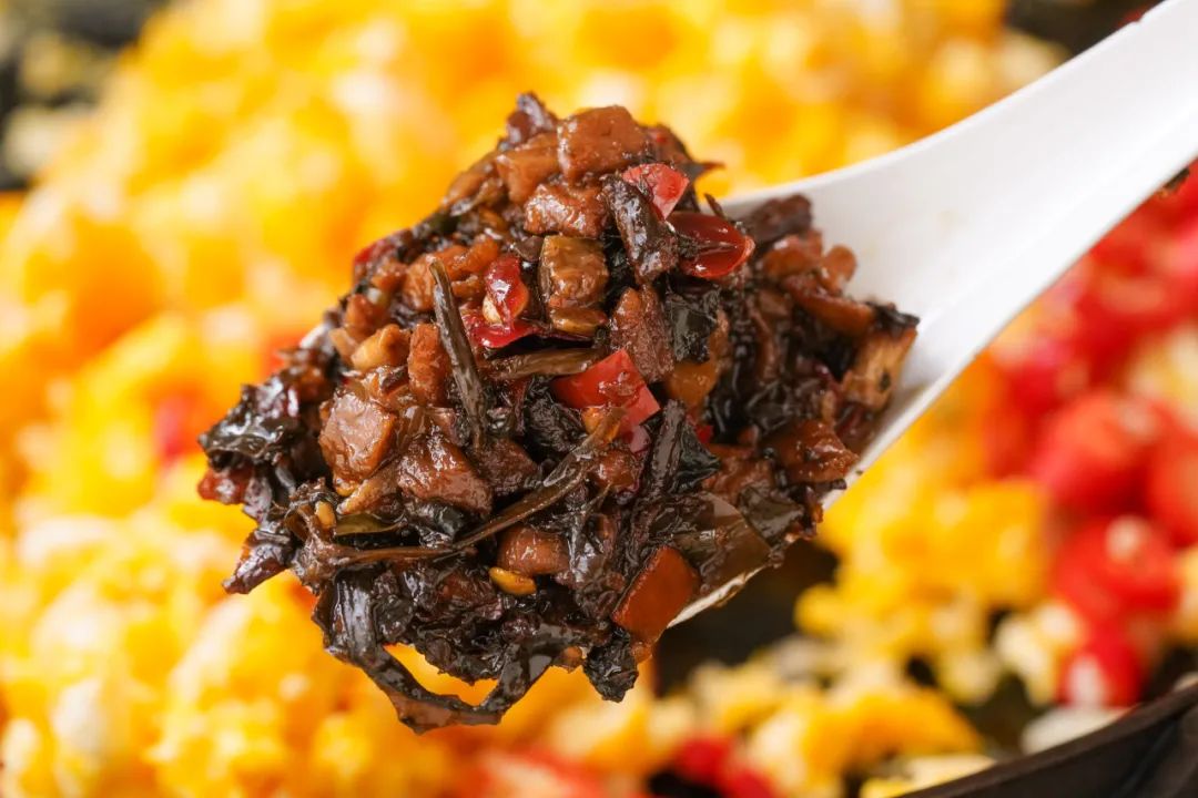2、加入2勺蒜末、1勺辣椒圈、2勺外婆菜(也可以用其他酱菜或者老干妈)炒匀。