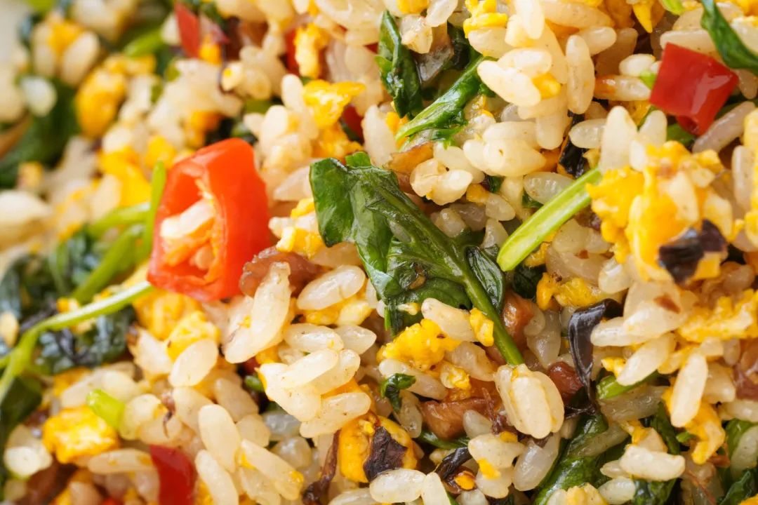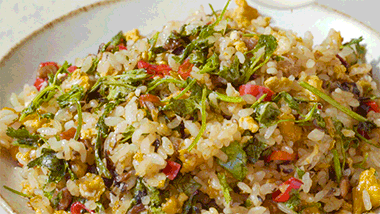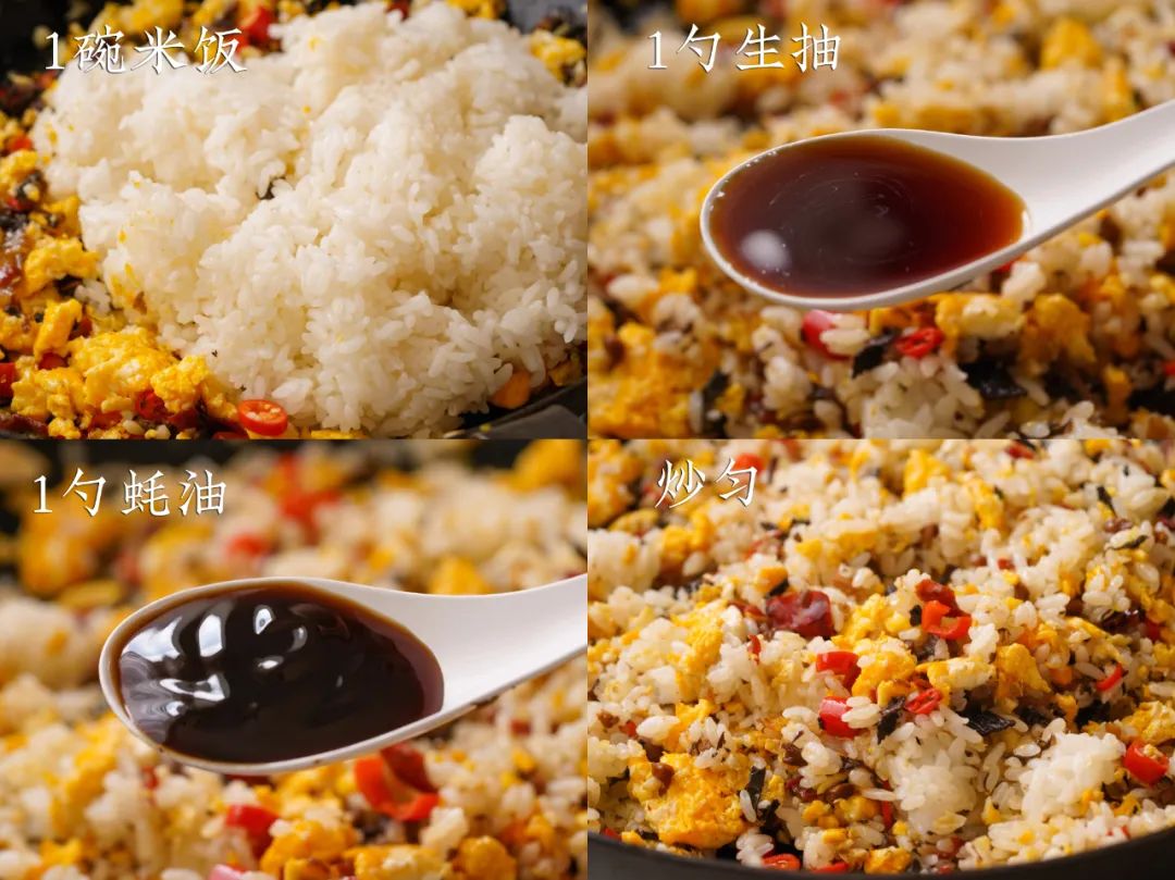 3、放入一碗米饭,中火翻炒均匀,加入1勺生抽、1勺蚝油继续炒匀。