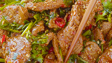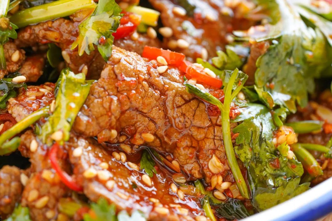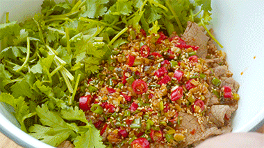 3、牛肉片入沸水中煮约1分钟至变色捞出。碗中放入牛肉片和500g香菜段,淋上料汁,抓拌均匀即可。
