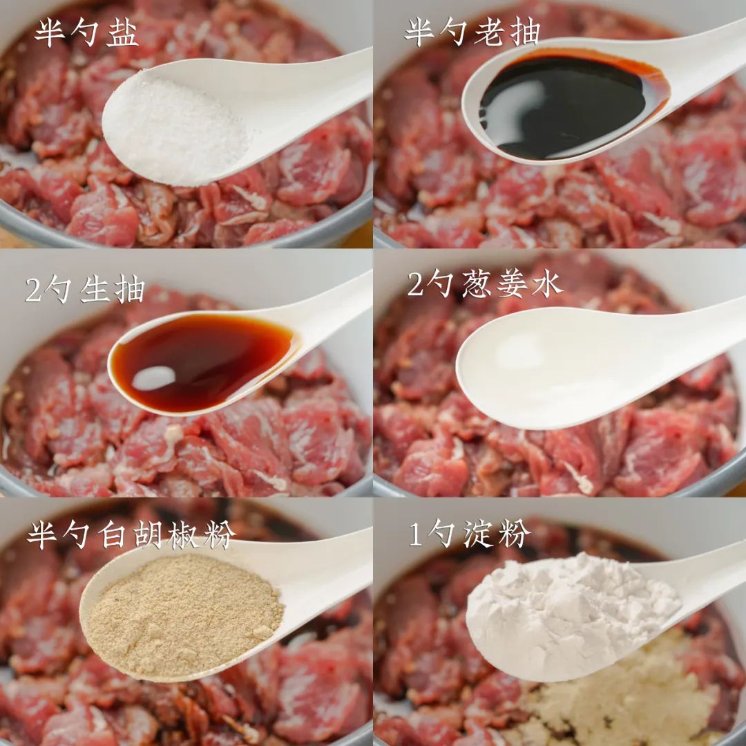 1、约2斤牛里脊肉切薄片,加半勺盐,半勺老抽,2勺生抽,2勺葱姜水,半勺白胡椒粉,1勺淀粉抓匀,继续放2勺食用油抓匀后(锁住水分)腌制15分钟。