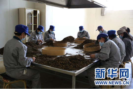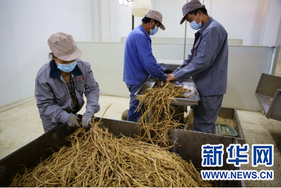 赤峰荣兴堂药业有限责任公司工人在药材挑选车间作业。新华网 石毅摄