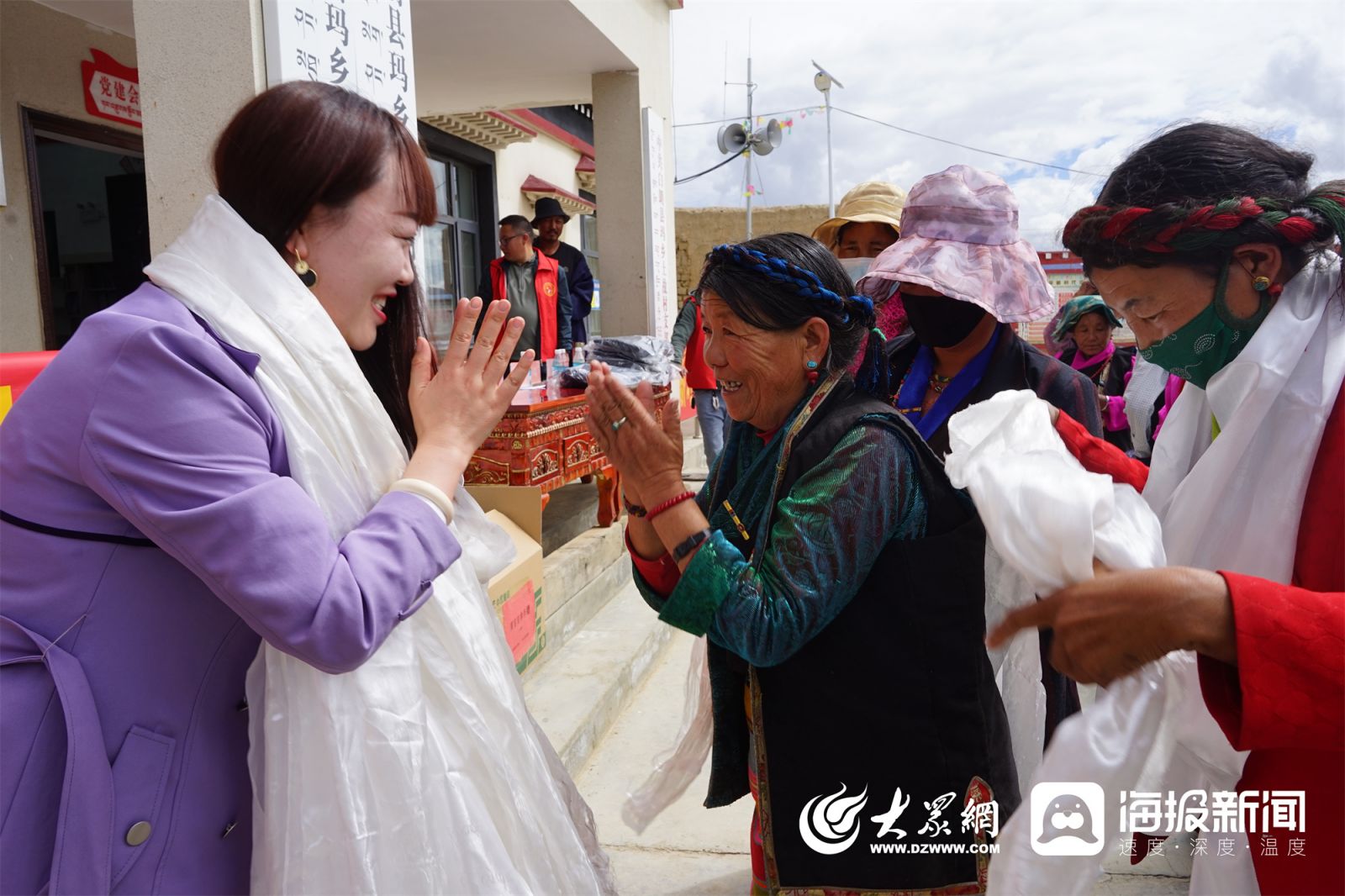在白朗县玛乡土故村,藏族同胞为商苗苗律师逐一献上哈达,感谢这位来自山东的援藏律师。