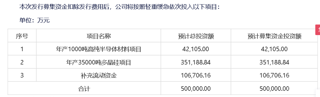 据招股书,大全能源IPO发行3亿股,每股发行价格为21.49元,募集资金总额达64.47亿元,募集资金投资额50亿元,主要用于投入年产1000吨高纯半导体材料项目(4.21亿元)、年产35000吨多晶硅项目(35.12亿元)和补充流动资金(10.67亿元)。