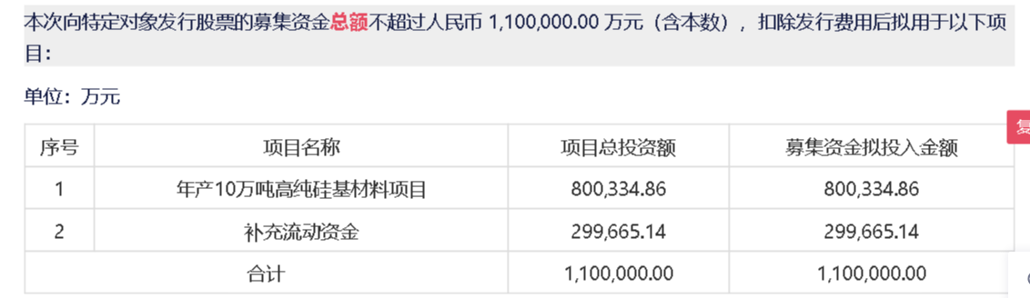 今年5月10日晚,大全能源发布了《2022年度向特定对象发行A股股票证券募集说明书(注册稿)》,拟发行5.78亿股,募集资金总额不超过110亿元,用于投入年产10万吨高纯硅基材料项目和补充流动资金。该项目由内蒙大全实施,总投资额80.03亿元,项目建设期1.5年。