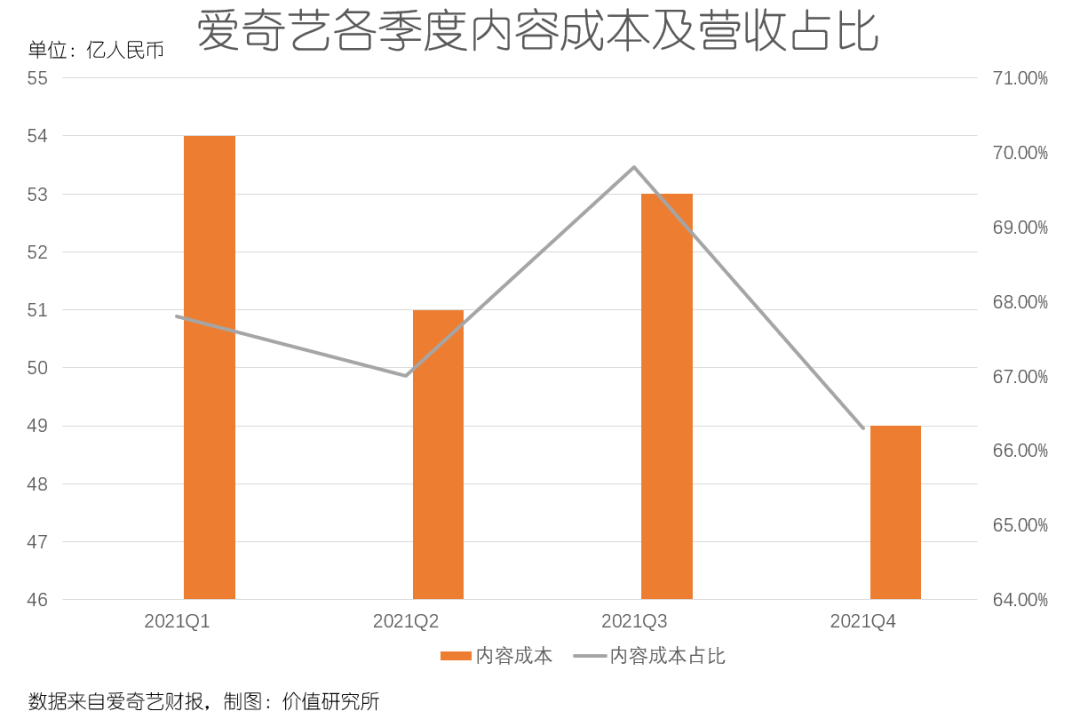 财报数据显示,自2019年一季度以来,爱奇艺的内容成本(包括外购版权及自制内容)占营收的比例一直维持在65%以上,在2019年四季度更一度高达84%的峰值。