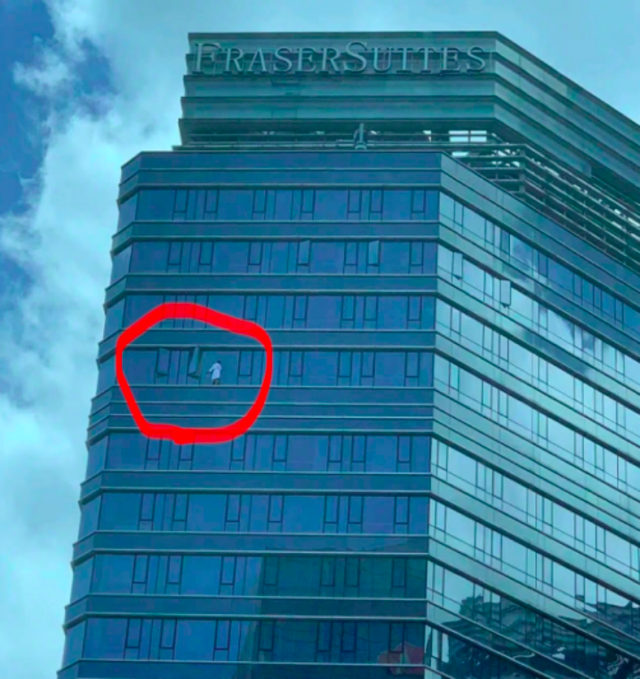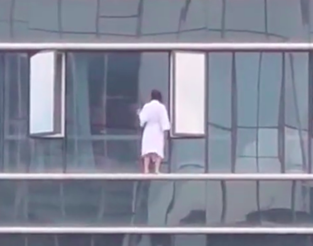 视频画面显示,该女子站在高楼外,身上没有穿戴任何防护装备,疑似与房间内的人发生争吵。