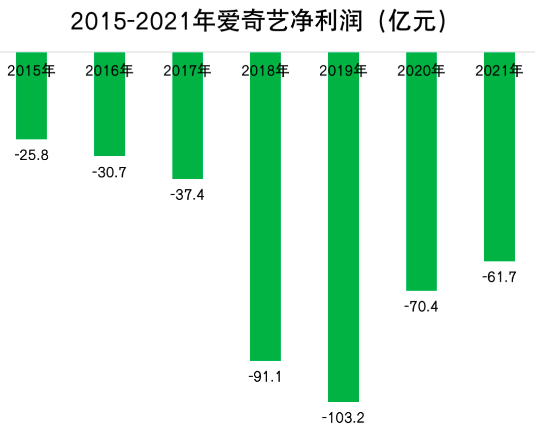 若以年为单位,爱奇艺自成立以来,就未曾盈利过,已经累计亏损了12年。根据财报显示,其2019年亏损103.3亿元,2020年亏损70.5亿元,2021年再度亏损61.7亿元,2015-2021年累计亏损超420亿元。