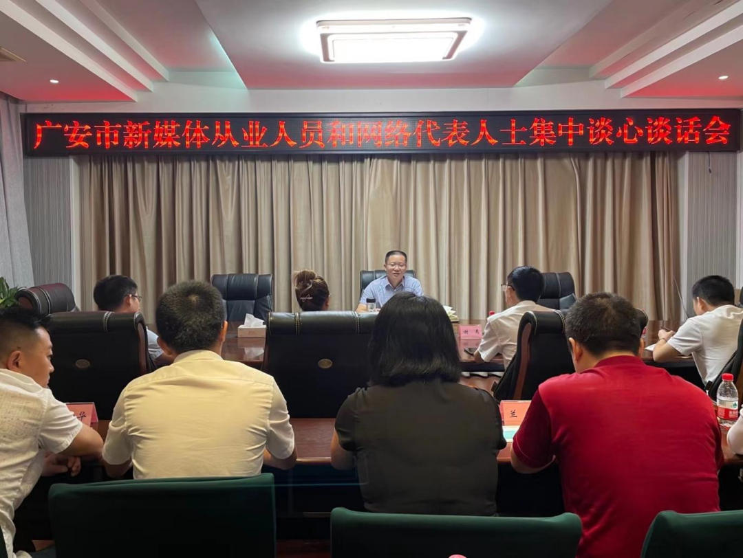 7月19日,广安市召开全市新媒体从业人员和网络代表人士集中谈心谈话会。市委统战部常务副部长舒伟主持会议并讲话。全市20余名新媒体从业人员及网络代表人士参加座谈。