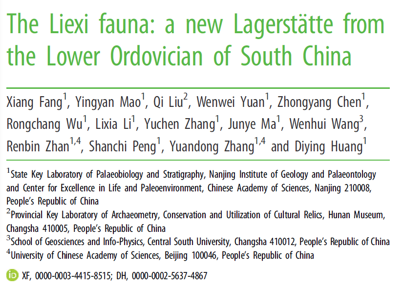 Fang, X., Mao, Y.Y., Liu, Q., Yuan, W.W., Chen, Z.Y., Wu, R.C., Li, L.X., Zhang, Y.C., Ma, J.Y., Wang, W.H., Zhan, R.B., Peng, S.C., Zhang, Y.D., Huang, D.Y.*, 2022. The Liexi fauna: a new Lagerstätte from the Lower Ordovician of South China. Proceedings of the Royal Society B, 289: 20221027.