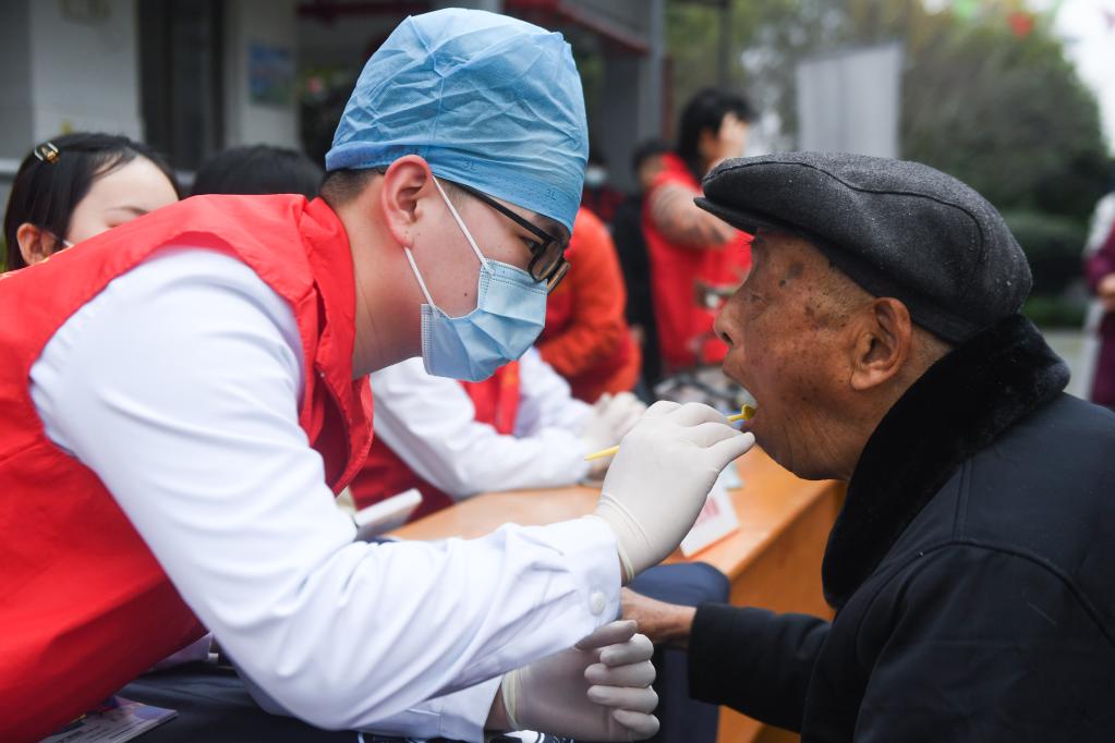 2022年3月4日,在浙江余姚市临山镇敬老院,志愿者在给老人检查口腔。新华社记者 徐昱 摄