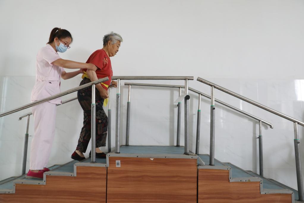 2021年7月3日,在河南省焦作市温县养老护理院医养中心,一名医护人员帮助一名老人进行康复训练。新华社发(徐宏星 摄)
