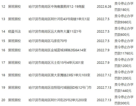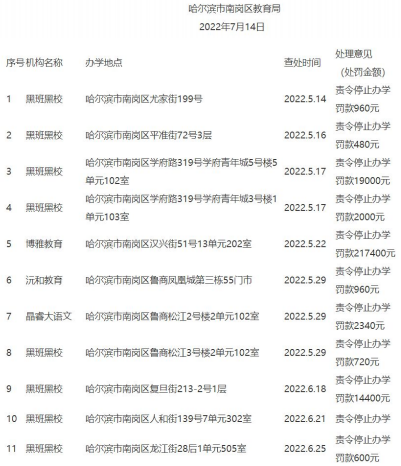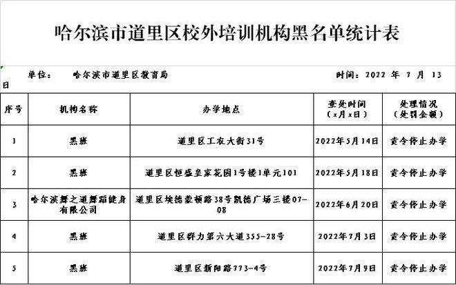 为进一步从严规范哈市校外培训机构培训行为,重点打击未经审批和登记的“黑培训机构”,21日,哈市公布了第十四批38家校外培训机构黑名单,提示学生和家长切勿到非法校外培训机构参加培训,若发现有违法违规培训行为,可通过电话或邮箱监督举报。