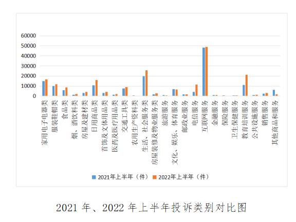 2022年上半年,商品与服务投诉均有所上升。从服务类看,互联网投诉仍占大头,占服务类投诉39.01%,主要涉及互联网接入服务和经营性互联网服务;其次是生活和社会服务(25555件)、教育培训服务(21067件)、电信服务(11409件),其中教育培训服务投诉持续快速增长,上半年涨幅达92.41%。而商品类中,除农用生产资料,其余9个类别投诉量均增长,其中,食品、日用商品和医药及医疗用品增速较快,涨幅分别为51.11%、50.91%和46.40%,三类增长量约占商品类投诉增长总量六成。