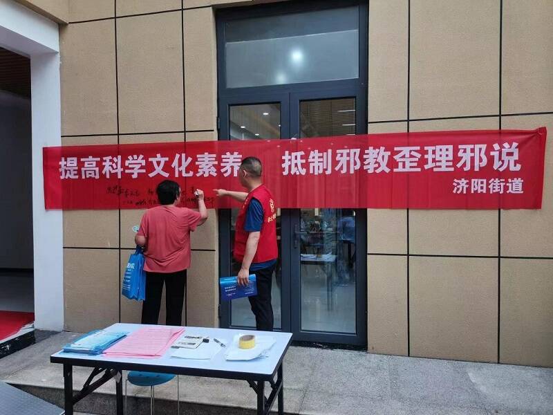 齐鲁网·闪电新闻7月21日讯 为扎实推进反邪教警示教育宣传工作,提高广大居民识邪、辨邪、防邪、拒邪的能力,近日,任城区济阳街道联合龙行社区,充分利用“社区居民赶大集”活动中人群多、范围广的好时机,通过悬挂标语横幅、设摊布展方式,组织开展了以“崇尚科学,反对邪教”为主题的反邪教宣传活动。