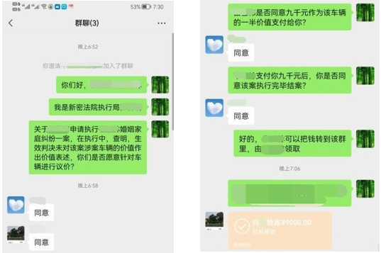 在微信群里,执行法官核实了双方的身份后,继续做执行工作,被执行人牛某也提出了和解方案。在执行法官的主持下,双方最终达成和解协议,被执行人牛某表示愿意将车辆现存价值的一半9000元交付给申请人雷某,并当即微信转账。至此,一起离婚纠纷案顺利执结。