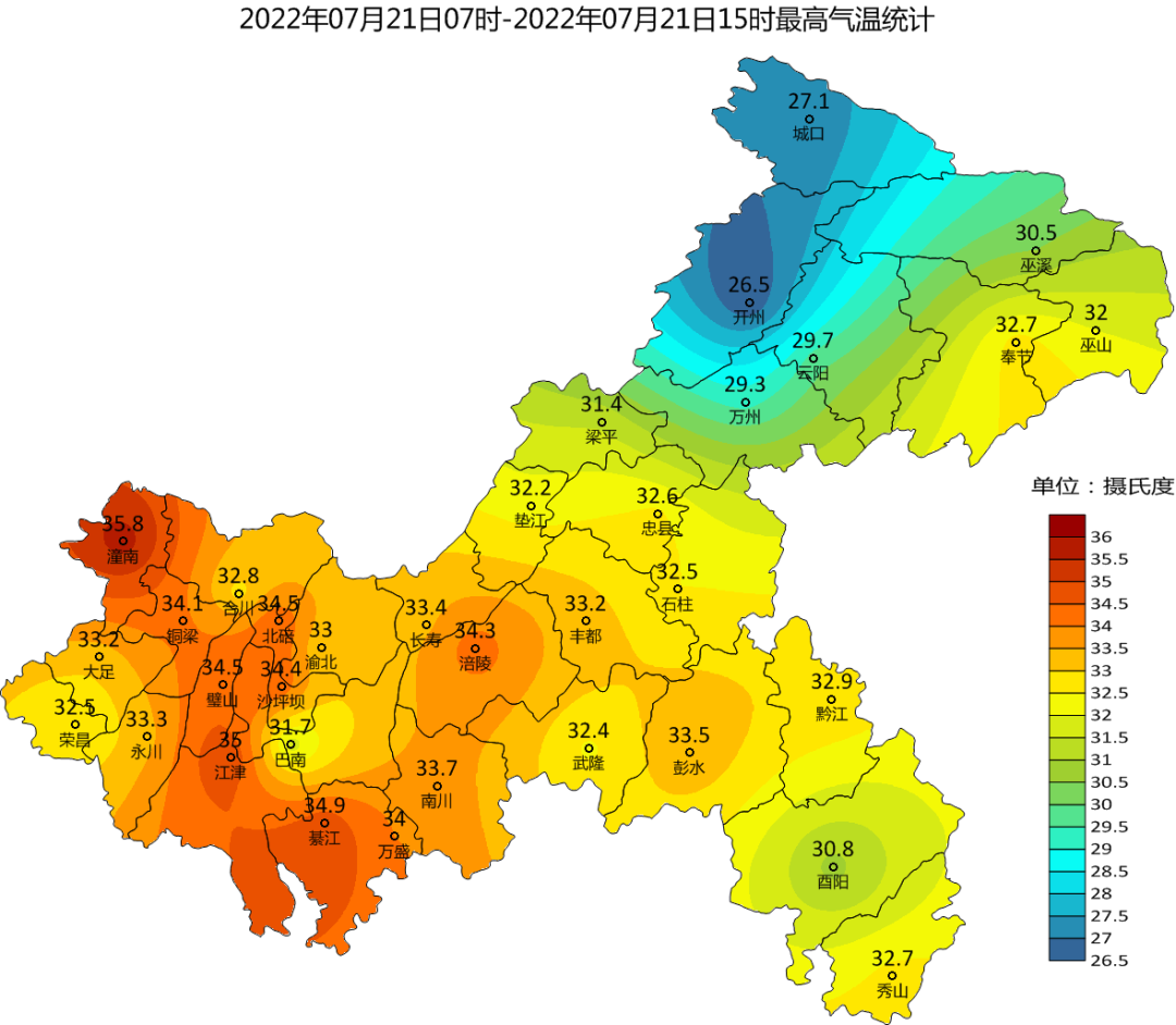 据实况监测显示,今日白天(7月21日7-15时)我市东北部部分地区阴天有阵雨,其余地区阴天到多云;气温方面,大部地区最高气温重回30℃以上,潼南和江津最高气温≥35℃,沙坪坝最高气温也升至了34.4℃。东北部的城口、开州、云阳和万州最高气温仍是“2”字开头,较为凉爽,羡慕了吗?