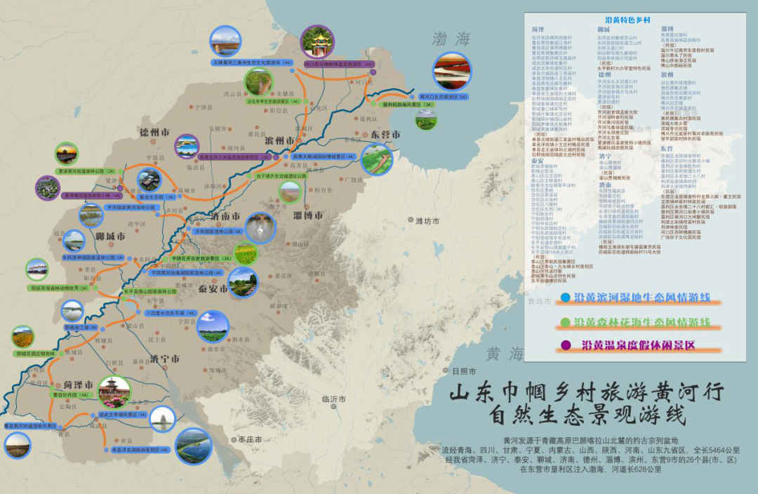 曹州牡丹园→鄄城苏泗庄银杏林→腊山国家森林公园→阳谷苏海森林动物世界→平阴县黄河玫瑰湖国家湿地公园→夏津黄河故道森林公园→邹平台子镇齐东古城遗址公园→沾化冬枣生态旅游景区→垦利稻田画风景区
