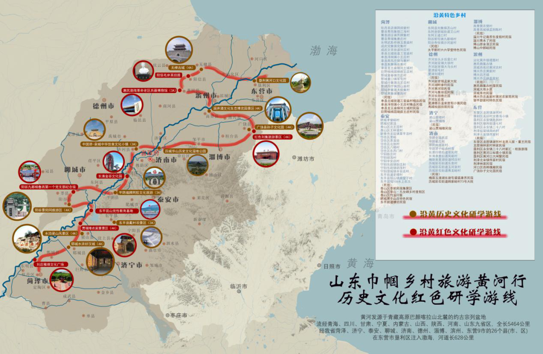 郓城水浒好汉城→梁山县水泊梁山风景区→东平戴村坝景区→阳谷景阳冈旅游区→平阴福牌阿胶文化旅游区→齐河中国驿·泉城中华饮食文化小镇→济南历城区华山历史文化湿地公园→广饶孙子文化园→高青国井酒文化生态博览园景区→无棣古城景区→东营垦利黄河口文化园