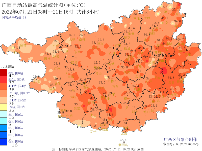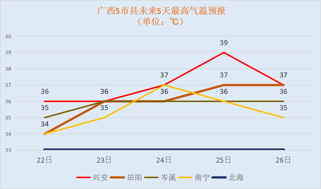 根据广西气象台数据显示,副热带高压把桂林拉回了高温势力范围。预计未来两天,高温范围将逐步扩大,不仅全广西大部最高气温都将维持在30℃以上,桂北部分地区气温还会上升到35℃-37℃,局部达到38℃以上。根据广西气象台发布的高温趋势图来看,阳朔20日的最高气温还在34℃,之后每天上涨1℃,直至本周末达到甚至突破38℃。