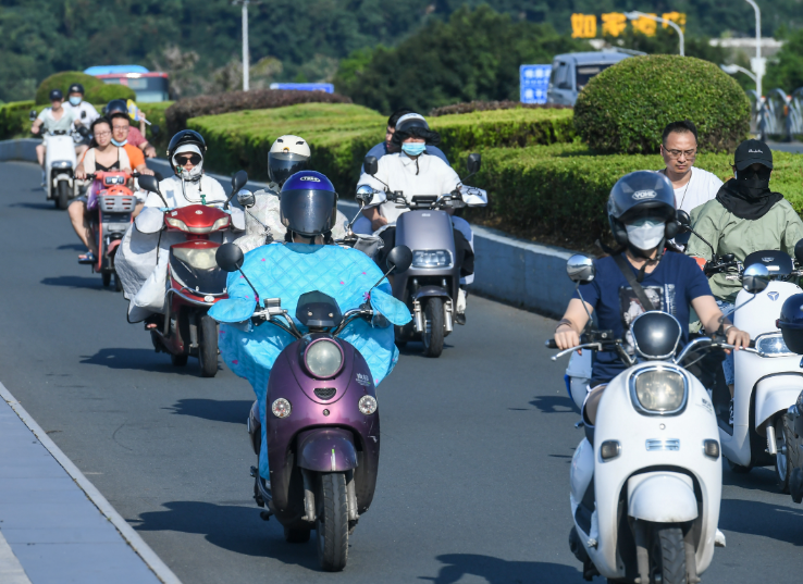 骑电动车的市民全副武装,遮阳防晒。