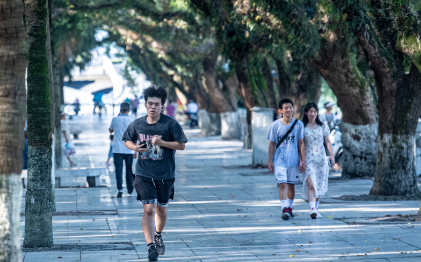 市民在滨江路的树荫下锻炼。