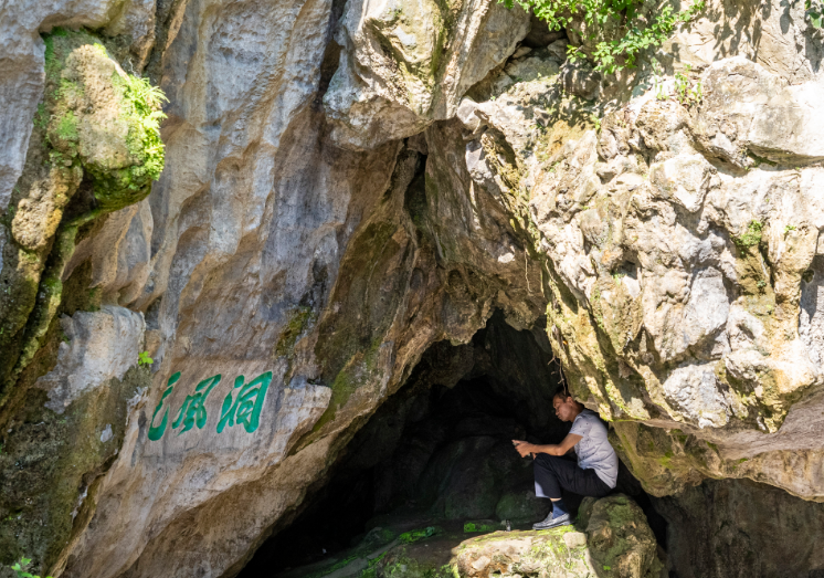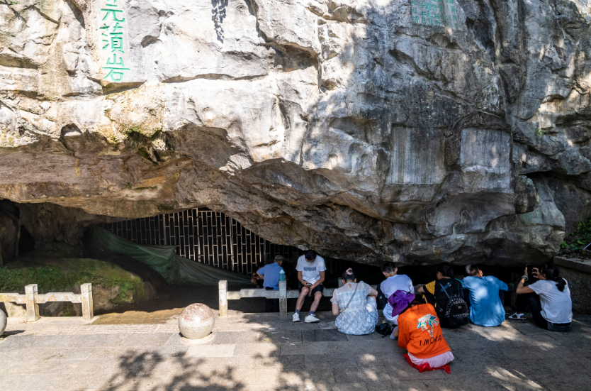 市民在七星景区元风洞前避暑纳凉。