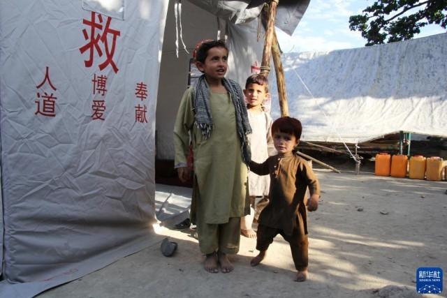 7月18日,在阿富汗地震重灾区帕克提卡省齐鲁克区,孩子们站在中国红十字会援助的救灾帐篷外。新华社发(萨巴文摄)