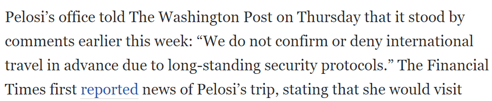 《金融时报》此前爆出“佩洛西计划访问台湾”的消息引起巨大争议后,佩洛西办公室当地时间21日告诉美国《华盛顿邮报》,“鉴于长期的安全协议,我们不会提前确认或否认国际出访行程”。