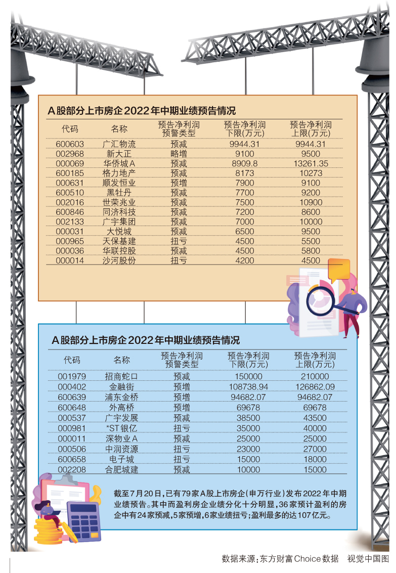 房地产行业的缩表阵痛,正反映在房企上半年的业绩报表上。据choice数据统计,截至7月20日,已有79家A股上市房企(申万行业)发布2022年中期业绩预告。其中,43家房企预计亏损,其中22家房企为首亏,12家房企增亏;亏损最多达46亿元。而盈利房企业绩分化十分明显,36家预计盈利房企中有24家预减,5家预增,6家业绩扭亏;盈利最多的达107亿元。