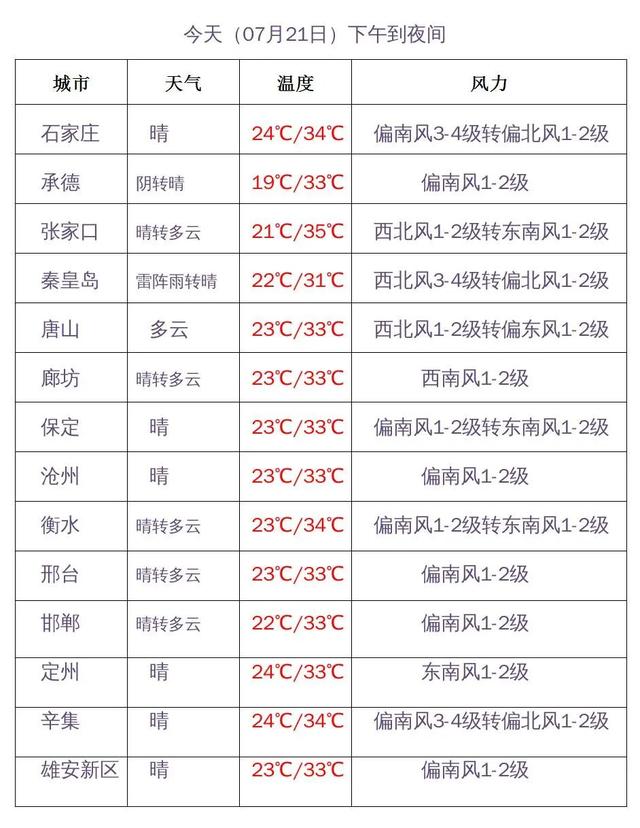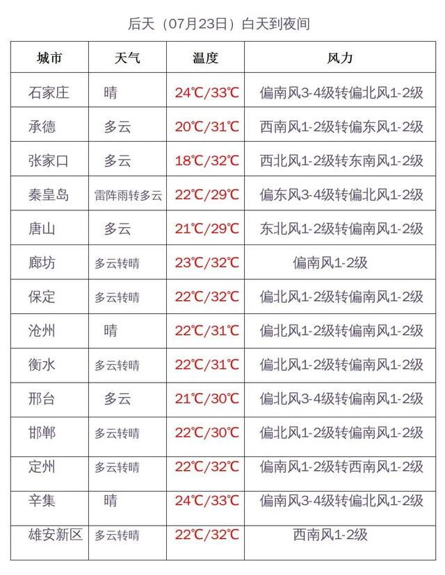 今天下午到夜间,承德东部、唐山北部、秦皇岛阴有零星阵雨转晴,其他地区晴间多云。最高气温,张家口北部、承德北部、秦皇岛北部、保定西北部29~31℃,其他地区32~35℃。最低气温,张家口、承德、秦皇岛北部、保定西北部15~20℃,其他地区21~24℃。
