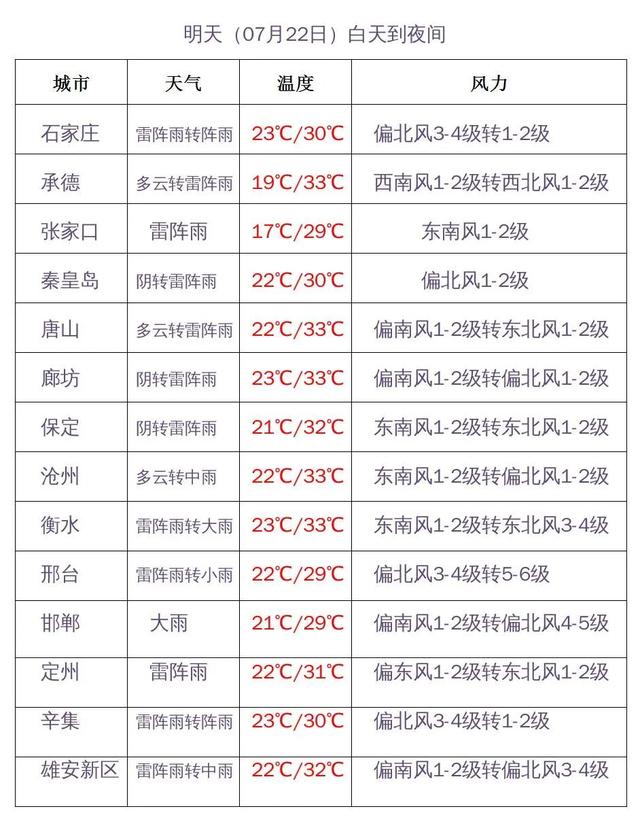 明天夜间到23日,沧州南部、衡水、邢台东部、邯郸东部阴有中到大雨,局地有暴雨,张家口西部、保定西北部阴转多云,其他地区阴有雷阵雨或阵雨转多云。