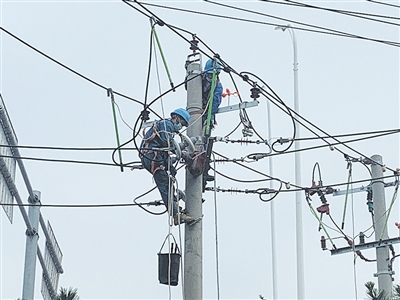 在作业现场,红白相间的安全围栏内,一辆黄色的绝缘斗臂车缓缓伸出粗壮的“手臂”,载着作业人员升往电杆的最顶端。烈日下,身穿绝缘工作服的员工在电杆顶端忙碌着,每项作业都一丝不苟。连续作业1个小时后,第一拨工作人员下场休息,他们身上绝缘服下的衣服已湿透。